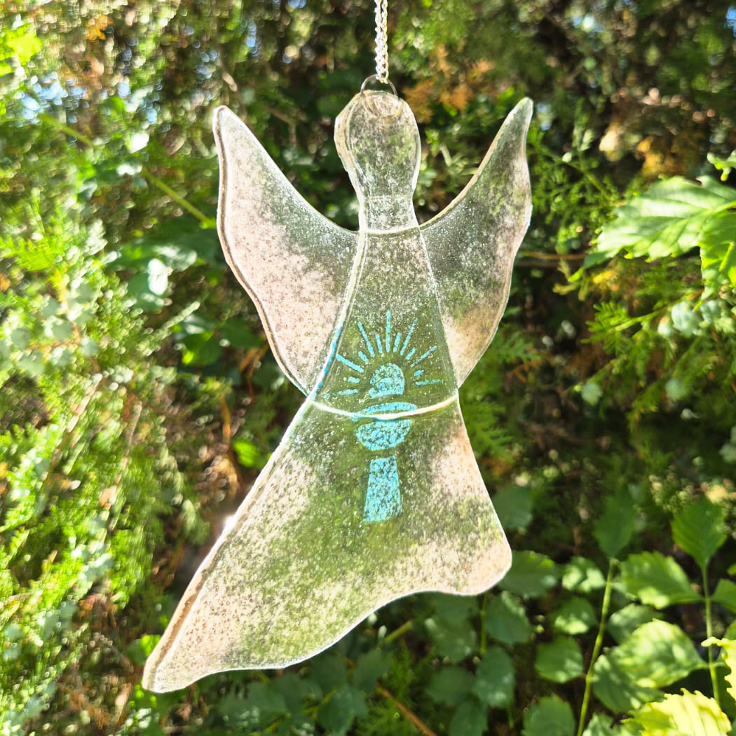 Praca wykonana i wcześniej ręcznie wyciętych elementów szklanych. Następnie udekorowano farbami do fusingu i wypalone w specjalistycznym piecu w temperaturze 810°C.
