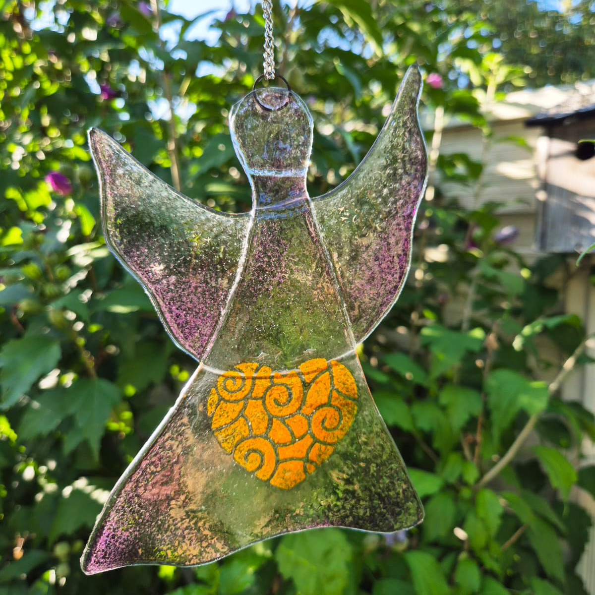 Praca wykonana i wcześniej ręcznie wyciętych elementów szklanych. Następnie udekorowano farbami do fusingu i wypalone w specjalistycznym piecu w temperaturze 810°C.