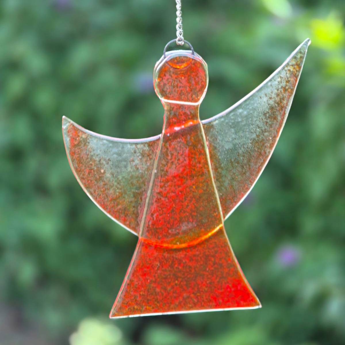 Praca wykonana i wcześniej ręcznie wyciętych elementów szklanych. Następnie udekorowano farbami do fusingu i wypalone w specjalistycznym piecu w temperaturze 810°C.