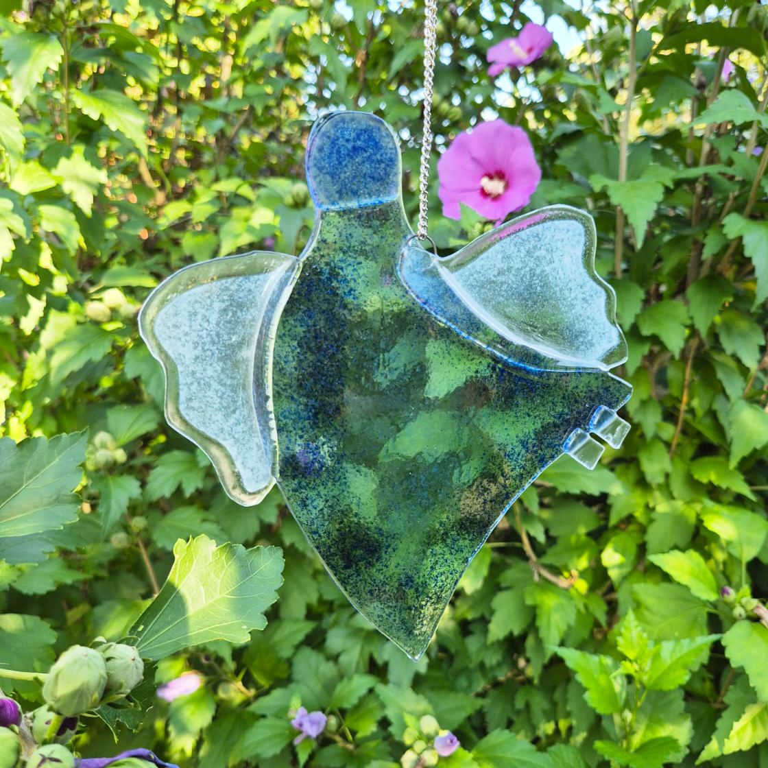 Praca wykonana i wcześniej ręcznie wyciętych elementów szklanych. Następnie udekorowano farbami do fusingu i wypalone w specjalistycznym piecu w temperaturze 810°C.