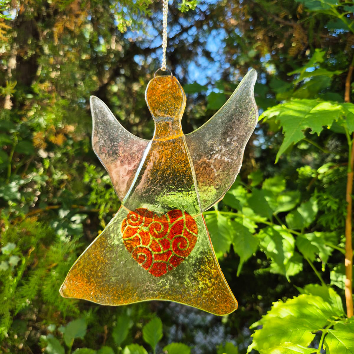 Praca wykonana i wcześniej ręcznie wyciętych elementów szklanych. Następnie udekorowano farbami do fusingu i wypalone w specjalistycznym piecu w temperaturze 810°C.