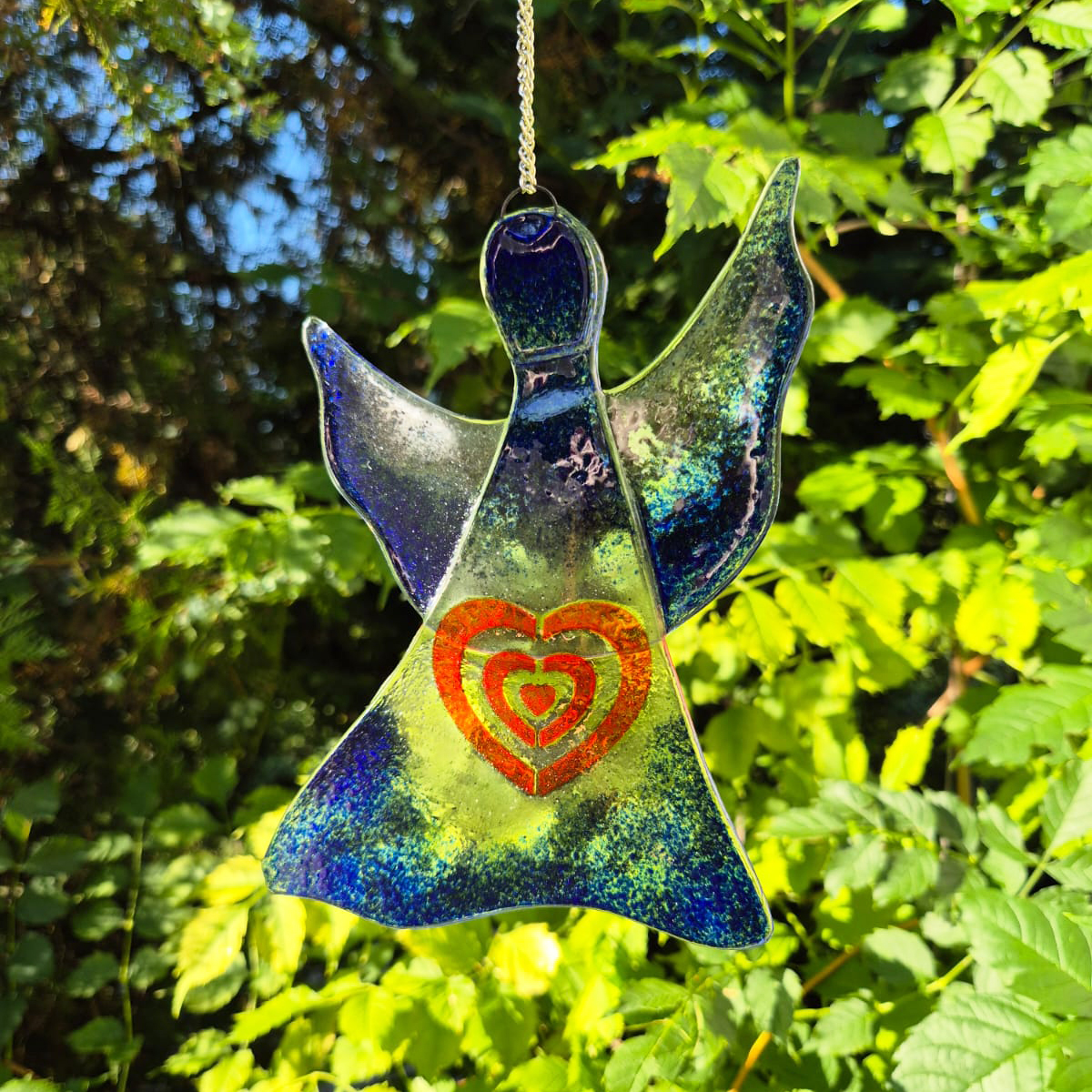 Praca wykonana i wcześniej ręcznie wyciętych elementów szklanych. Następnie udekorowano farbami do fusingu i wypalone w specjalistycznym piecu w temperaturze 810°C.