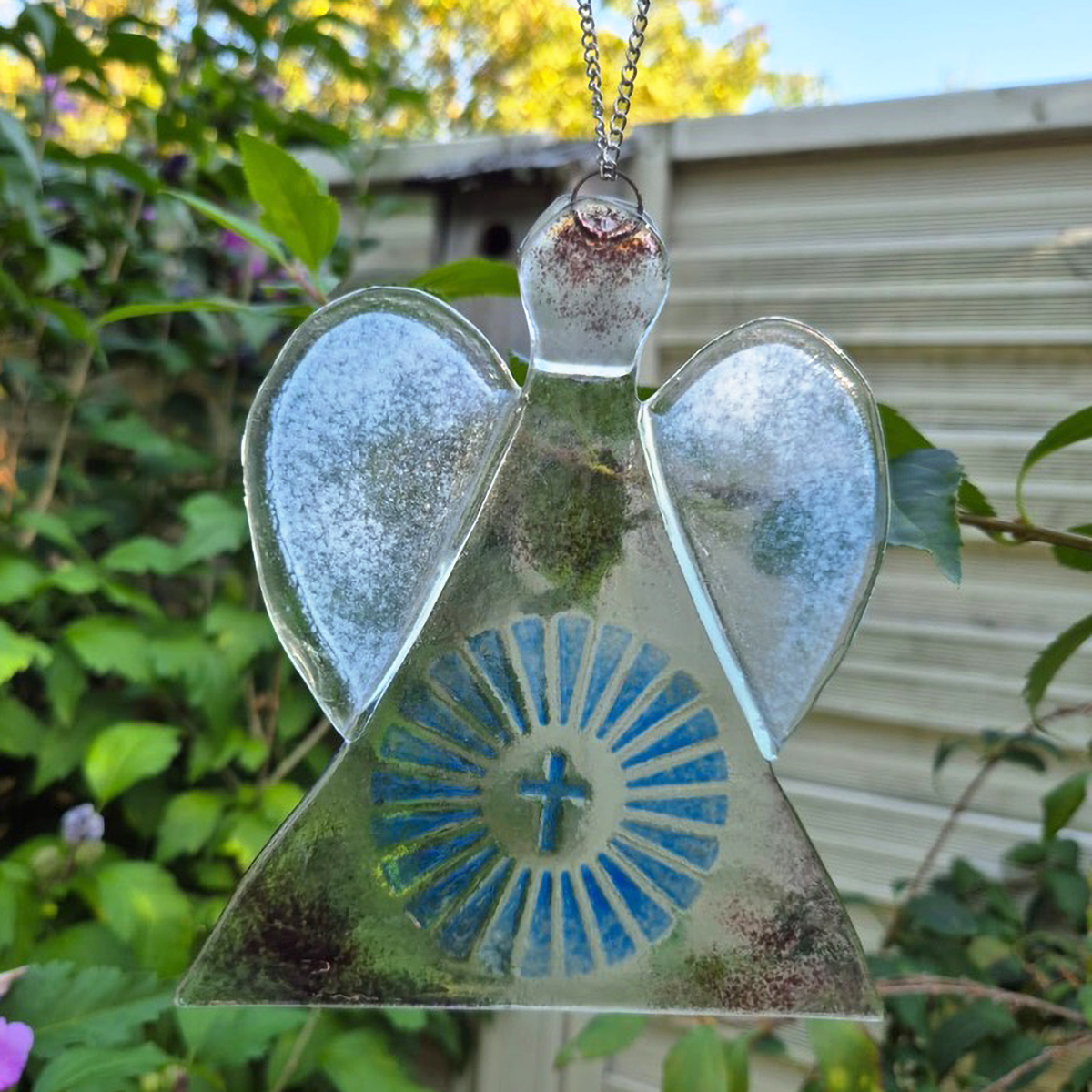 Praca wykonana i wcześniej ręcznie wyciętych elementów szklanych. Następnie udekorowano farbami do fusingu i wypalone w specjalistycznym piecu w temperaturze 810°C.