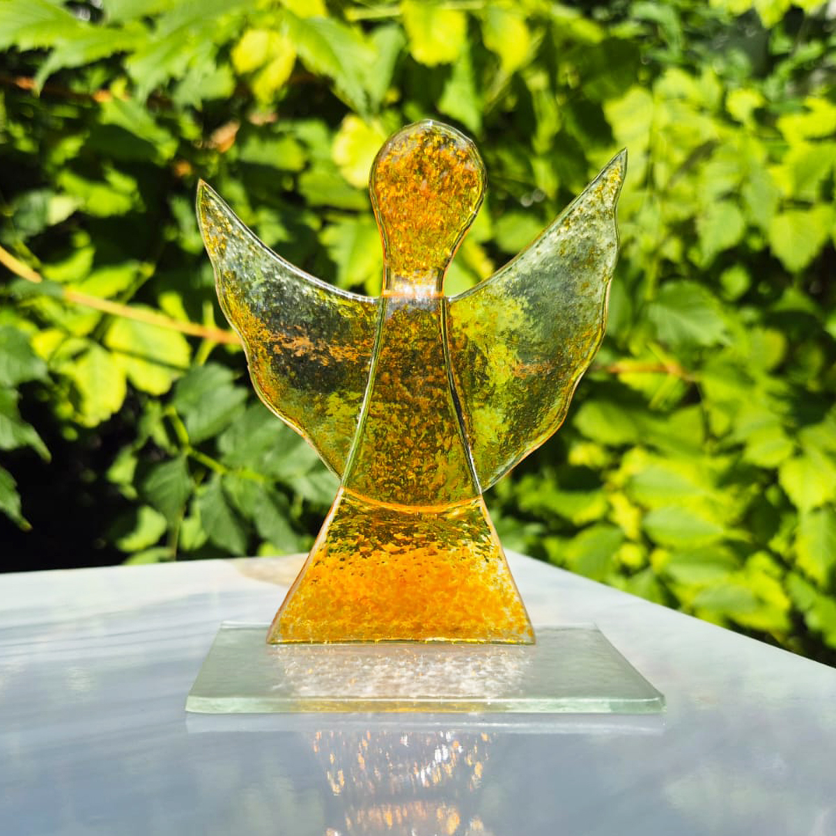 Praca wykonana i wcześniej ręcznie wyciętych elementów szklanych. Następnie udekorowano farbami do fusingu i wypalone w specjalistycznym piecu w temperaturze 810°C.