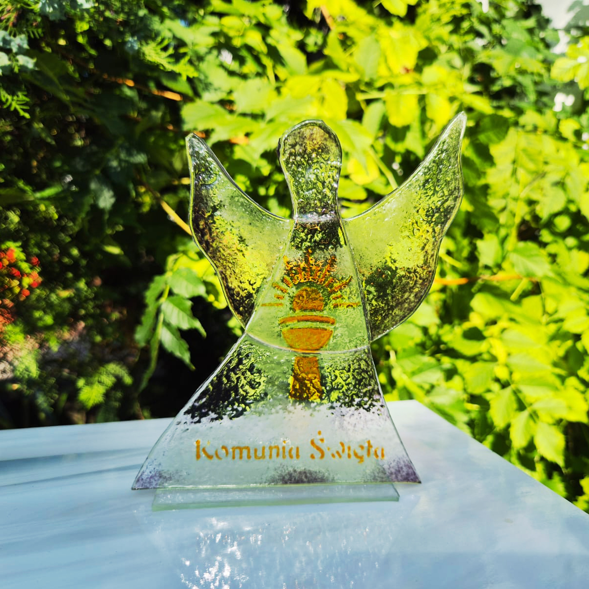 Praca wykonana i wcześniej ręcznie wyciętych elementów szklanych. Następnie udekorowano farbami do fusingu i wypalone w specjalistycznym piecu w temperaturze 810°C.