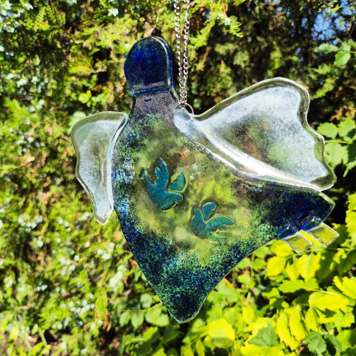 Praca wykonana i wcześniej ręcznie wyciętych elementów szklanych. Następnie udekorowano farbami do fusingu i wypalone w specjalistycznym piecu w temperaturze 810°C.