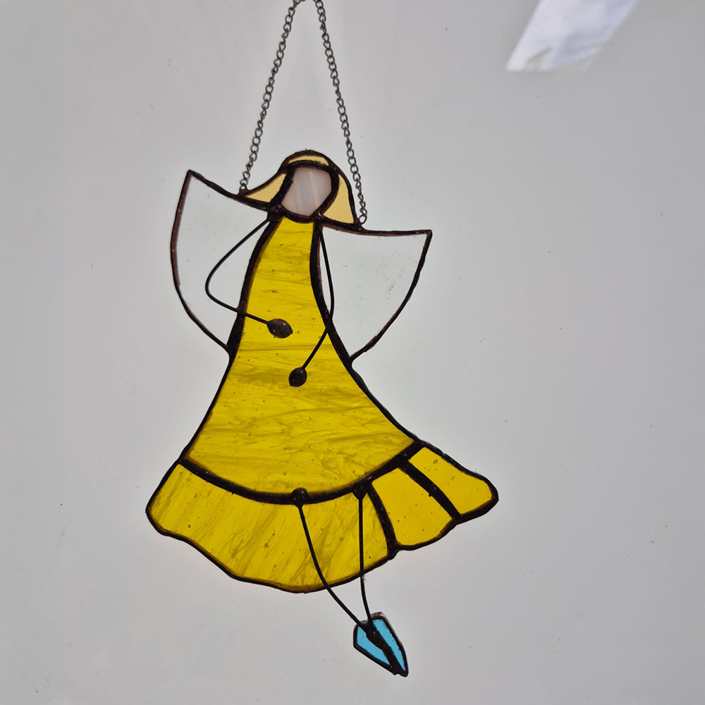 Wiszący aniołek – szklana zawieszka wykonana ręcznie w technice witrażowej, idealna jako dekoracja lub prezent.
