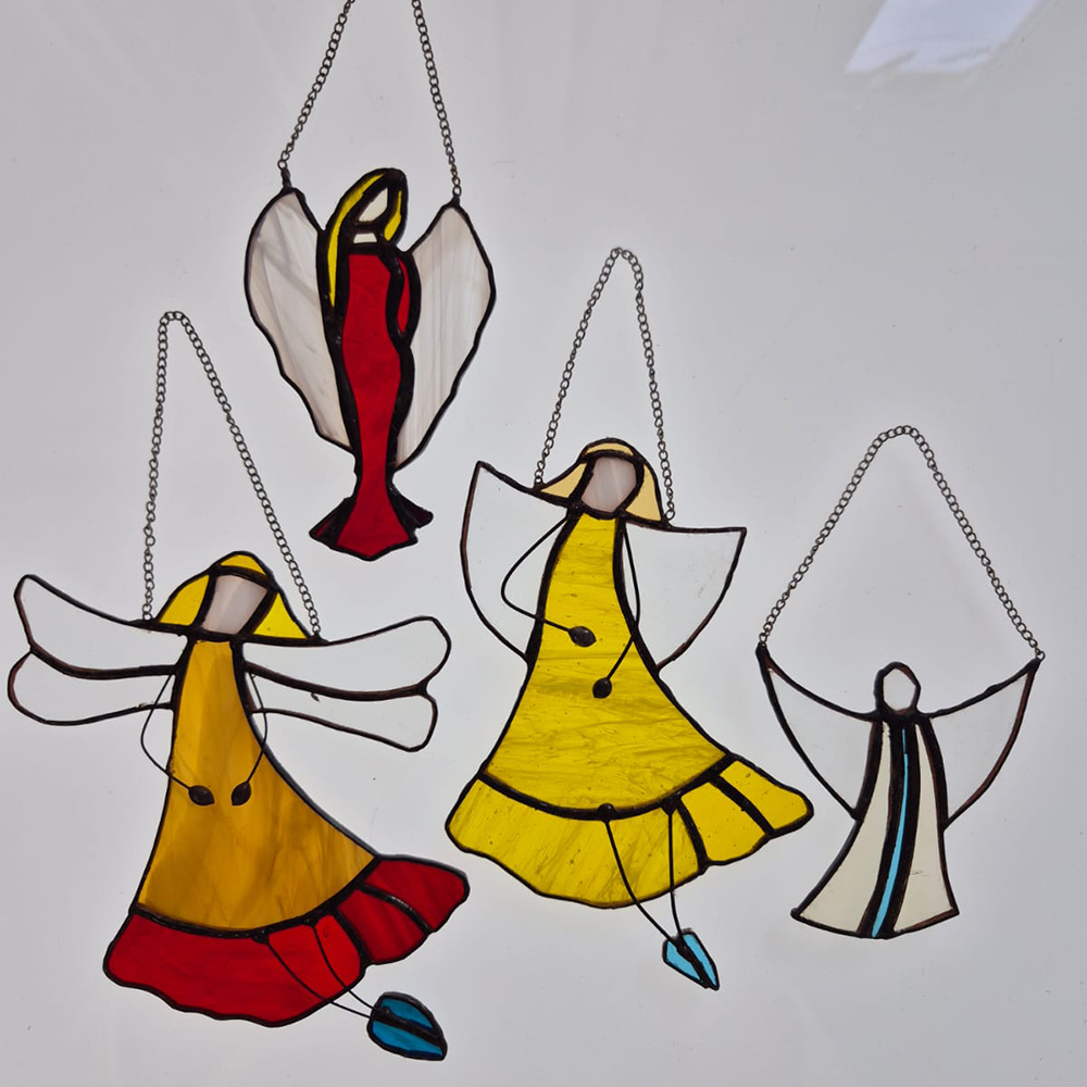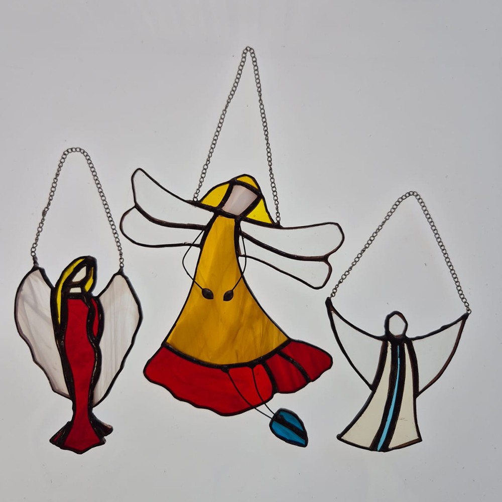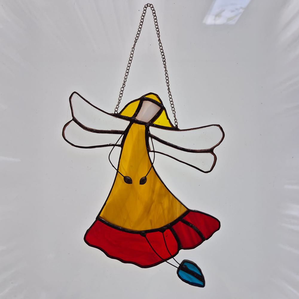 Aniołek wiszący to delikatna zawieszka wykonana tradycyjną techniką witrażową. Ręcznie wycinane kawałki szkła, oprawione i zlutowane, tworzą subtelną i pełną uroku kompozycję, która pięknie prezentuje się zawieszona w oknie lub jako ozdoba świąteczna. To także symboliczny i wyjątkowy upominek dla bliskiej osoby.