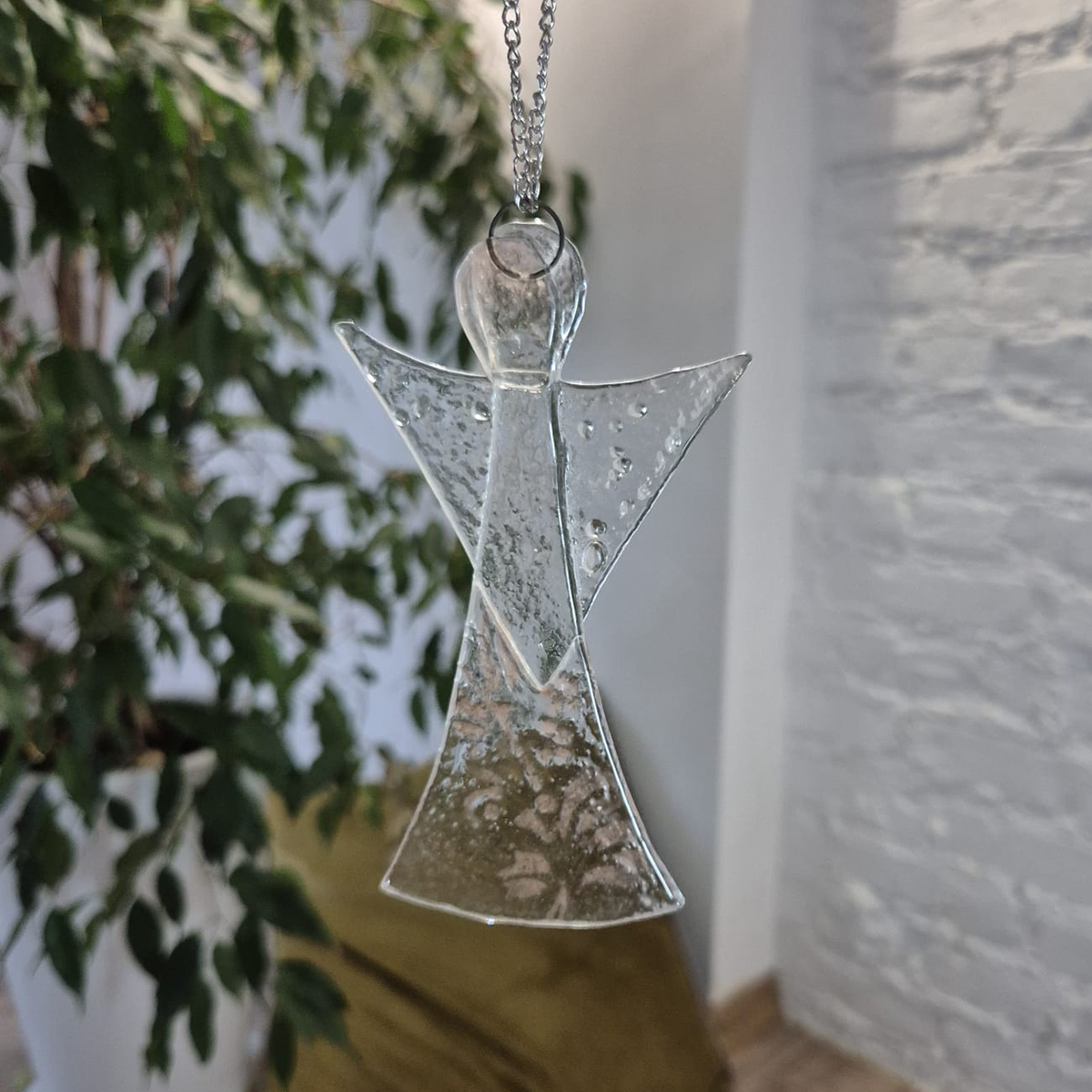 Ten wyjątkowy aniołek to ręcznie wykonana ozdoba, która wniesie do Twojego domu odrobinę świątecznej magii. Stworzony metodą fusingu – stapiania szkła w wysokiej temperaturze – zachwyca delikatnymi detalami i subtelnym blaskiem. Idealny do zawieszenia na choince lub jako prezent, który wyrazi ciepłe uczucia.