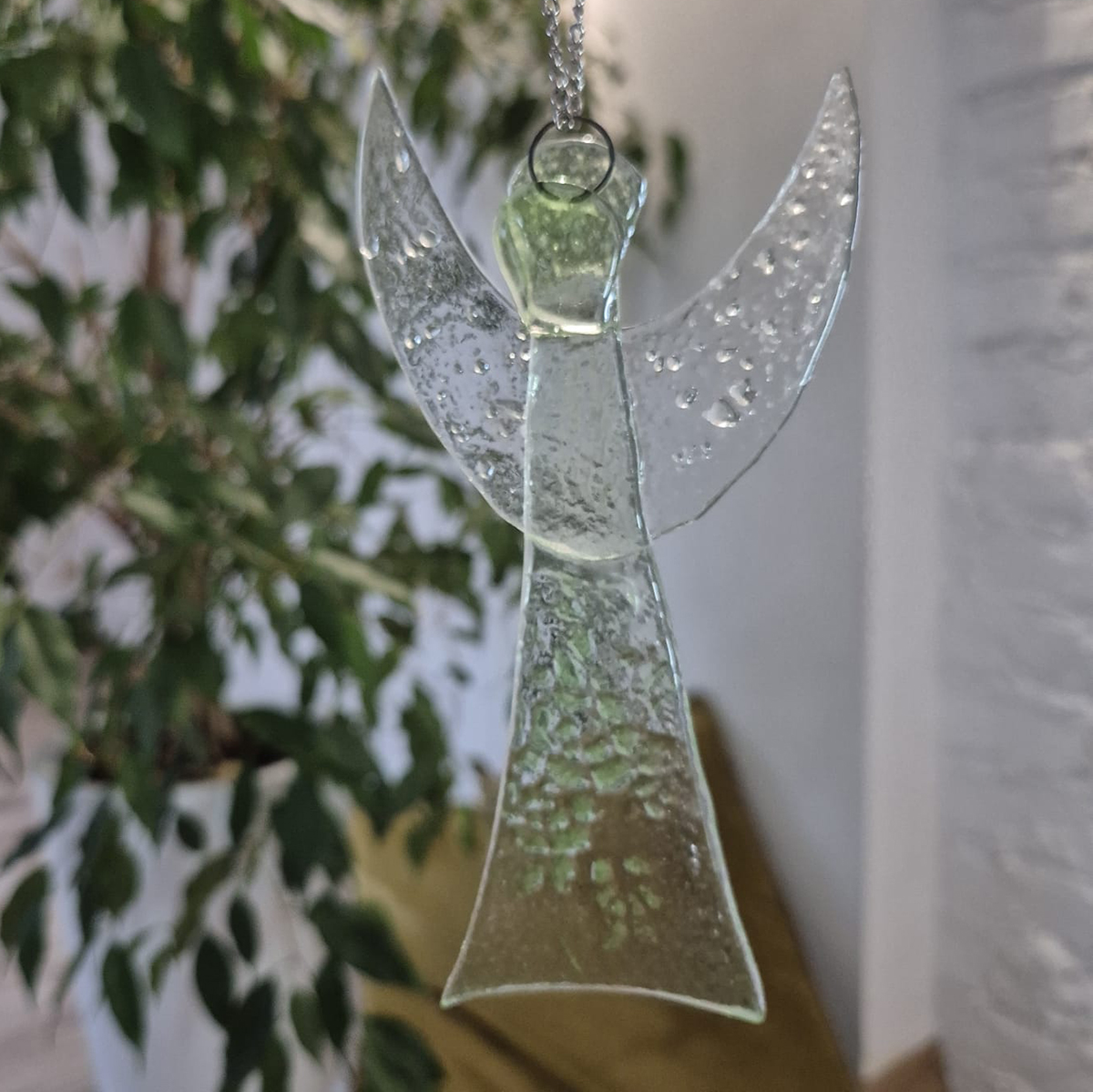 Ten wyjątkowy aniołek to ręcznie wykonana ozdoba, która wniesie do Twojego domu odrobinę świątecznej magii. Stworzony metodą fusingu – stapiania szkła w wysokiej temperaturze – zachwyca delikatnymi detalami i subtelnym blaskiem. Idealny do zawieszenia na choince lub jako prezent, który wyrazi ciepłe uczucia.