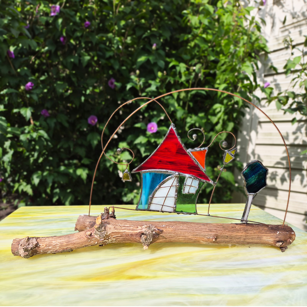 Witraże wykonane metodą Tiffany’ego. Po uprzednim przygotowaniu projektu, z tafli szkła witrażowego wycina się pojedyncze detale i odpowiednio szlifuje. Następnie owijamy każdy szklany element cieką miedzianą taśmą i łączymy za pomocą cyny.