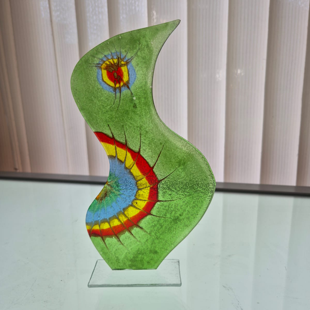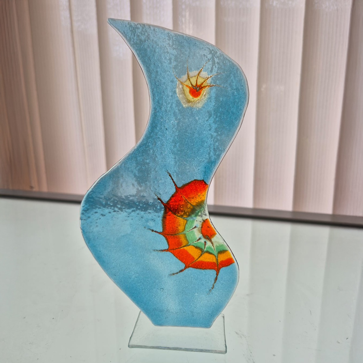 Bajkowy ptak ze szkła wykonany metodą fusingu – stojąca ozdoba o unikatowym charakterze, pełna koloru i fantazji.