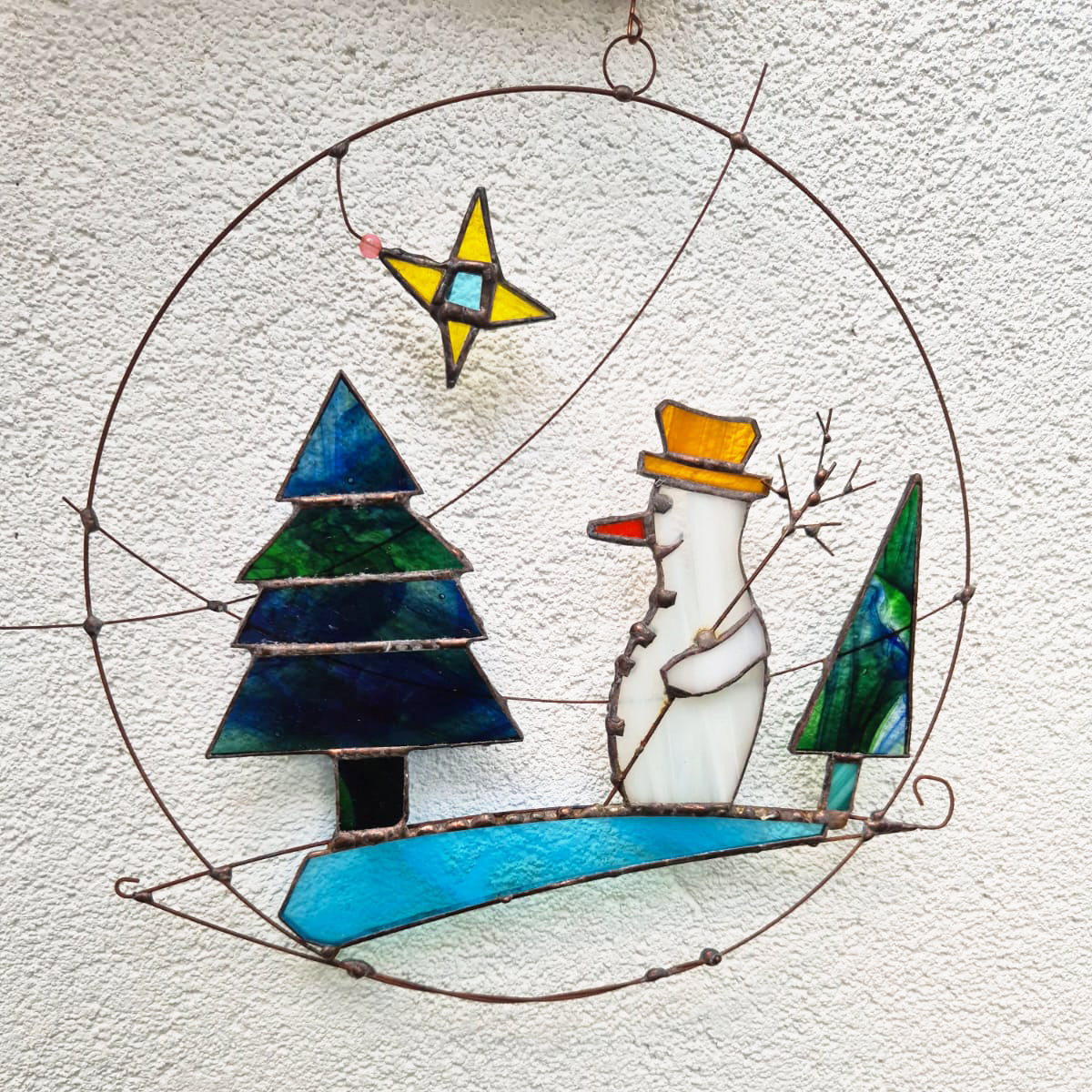 Witraże wykonane metodą Tiffany’ego. Po uprzednim przygotowaniu projektu, z tafli szkła witrażowego wycina się pojedyncze detale i odpowiednio szlifuje. Następnie owijamy każdy szklany element cieką miedzianą taśmą i łączymy za pomocą cyny.