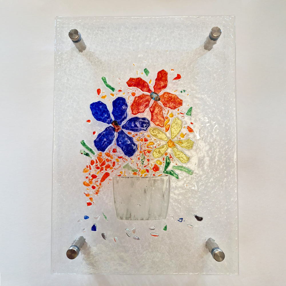 Szklany obraz wiszący wykonany metodą fusingu przedstawia barwny bukiet kwiatów, pełen lekkości, koloru i radości. Każdy element został ręcznie ułożony i wypalony w piecu, co nadaje pracy trwałość i unikatowy charakter. Obraz montowany jest na dystansach, które dodają mu elegancji i pozwalają subtelnie odsunąć go od ściany, podkreślając jego formę i grę światła w szkle.