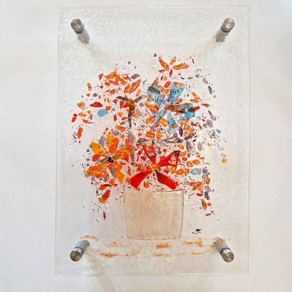 Szklany obraz wiszący wykonany metodą fusingu przedstawia barwny bukiet kwiatów, pełen lekkości, koloru i radości. Każdy element został ręcznie ułożony i wypalony w piecu, co nadaje pracy trwałość i unikatowy charakter. Obraz montowany jest na dystansach, które dodają mu elegancji i pozwalają subtelnie odsunąć go od ściany, podkreślając jego formę i grę światła w szkle.