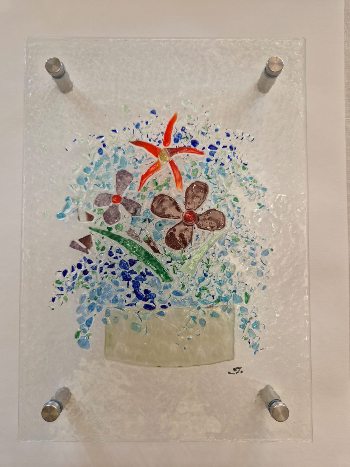 Szklany obraz wiszący wykonany metodą fusingu przedstawia barwny bukiet kwiatów, pełen lekkości, koloru i radości. Każdy element został ręcznie ułożony i wypalony w piecu, co nadaje pracy trwałość i unikatowy charakter. Obraz montowany jest na dystansach, które dodają mu elegancji i pozwalają subtelnie odsunąć go od ściany, podkreślając jego formę i grę światła w szkle.