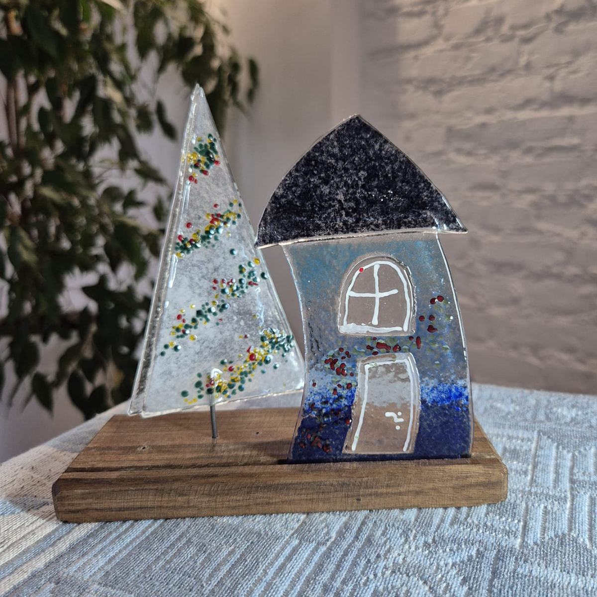 Wyjątkowa szklana kompozycja przedstawiająca choinkę obok domku to piękna dekoracja, która doda uroku każdemu wnętrzu. Wykonana ręcznie metodą fusingu zachwyca subtelnym blaskiem szkła. Ten unikalny element wystroju doskonale nadaje się na parapet, półkę czy komodę, wprowadzając przytulną i artystyczną atmosferę. Ręczne wykonanie sprawia, że każda sztuka jest jedyna w swoim rodzaju, a jej uniwersalny charakter pasuje do różnych stylów wnętrzarskich.