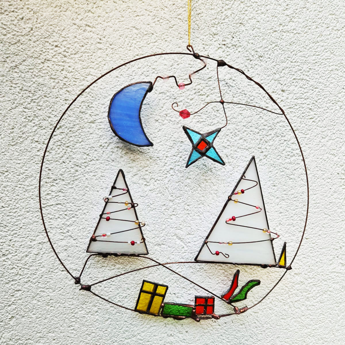 Witraże wykonane metodą Tiffany’ego. Po uprzednim przygotowaniu projektu, z tafli szkła witrażowego wycina się pojedyncze detale i odpowiednio szlifuje. Następnie owijamy każdy szklany element cieką miedzianą taśmą i łączymy za pomocą cyny.