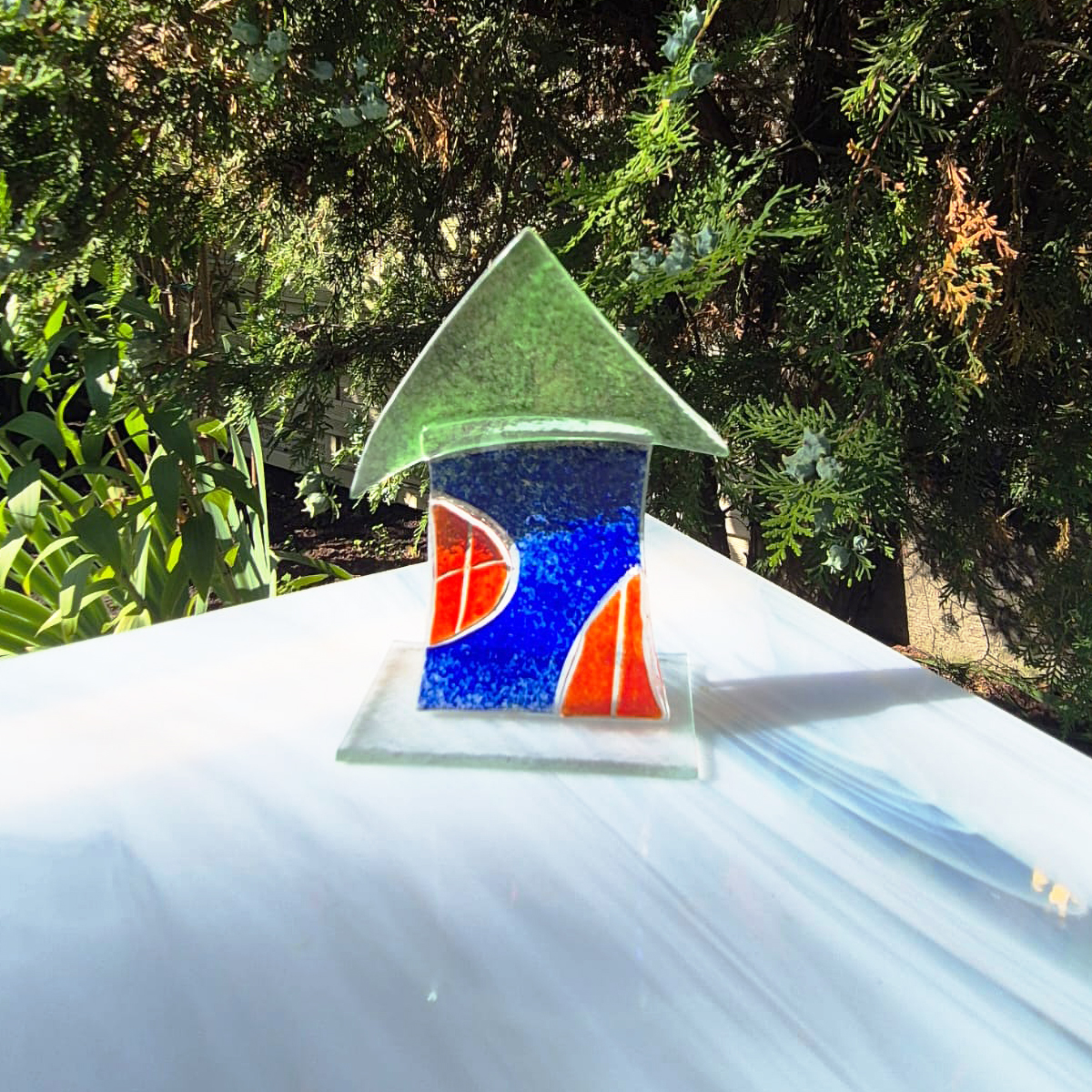 Praca wykonana i wcześniej ręcznie wyciętych elementów szklanych. Następnie udekorowano farbami do fusingu i wypalone w specjalistycznym piecu w temperaturze 810°C.