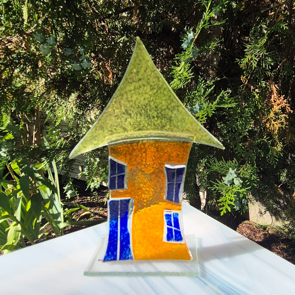 Praca wykonana i wcześniej ręcznie wyciętych elementów szklanych. Następnie udekorowano farbami do fusingu i wypalone w specjalistycznym piecu w temperaturze 810°C.