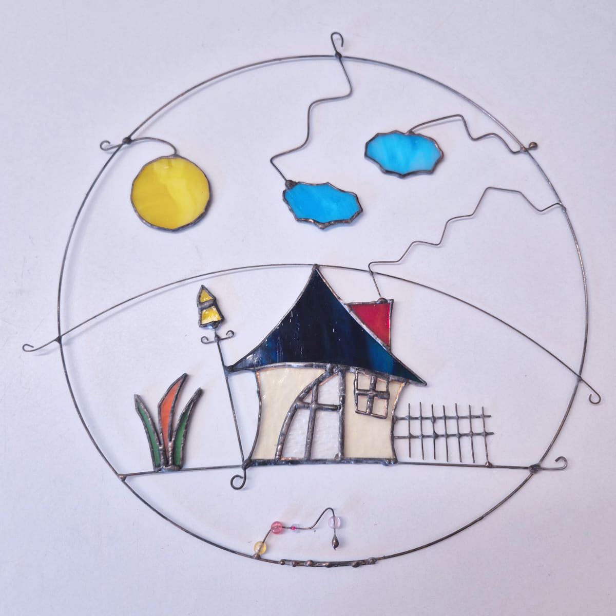 Witraże wykonane metodą Tiffany’ego. Po uprzednim przygotowaniu projektu, z tafli szkła witrażowego wycina się pojedyncze detale i odpowiednio szlifuje. Następnie owijamy każdy szklany element cieką miedzianą taśmą i łączymy za pomocą cyny.