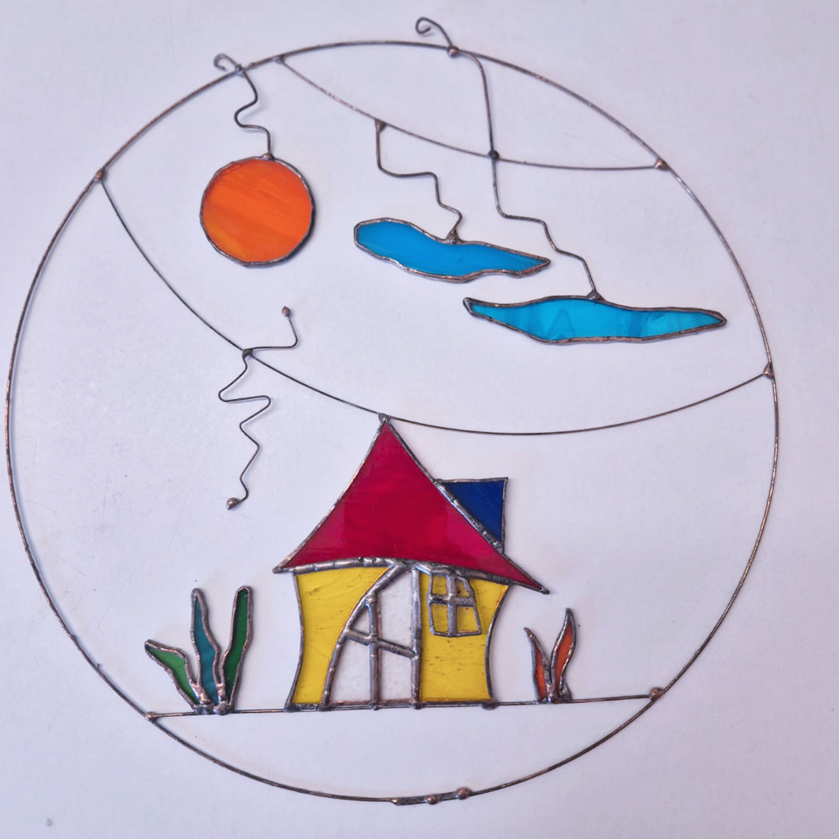 Witraże wykonane metodą Tiffany’ego. Po uprzednim przygotowaniu projektu, z tafli szkła witrażowego wycina się pojedyncze detale i odpowiednio szlifuje. Następnie owijamy każdy szklany element cieką miedzianą taśmą i łączymy za pomocą cyny.