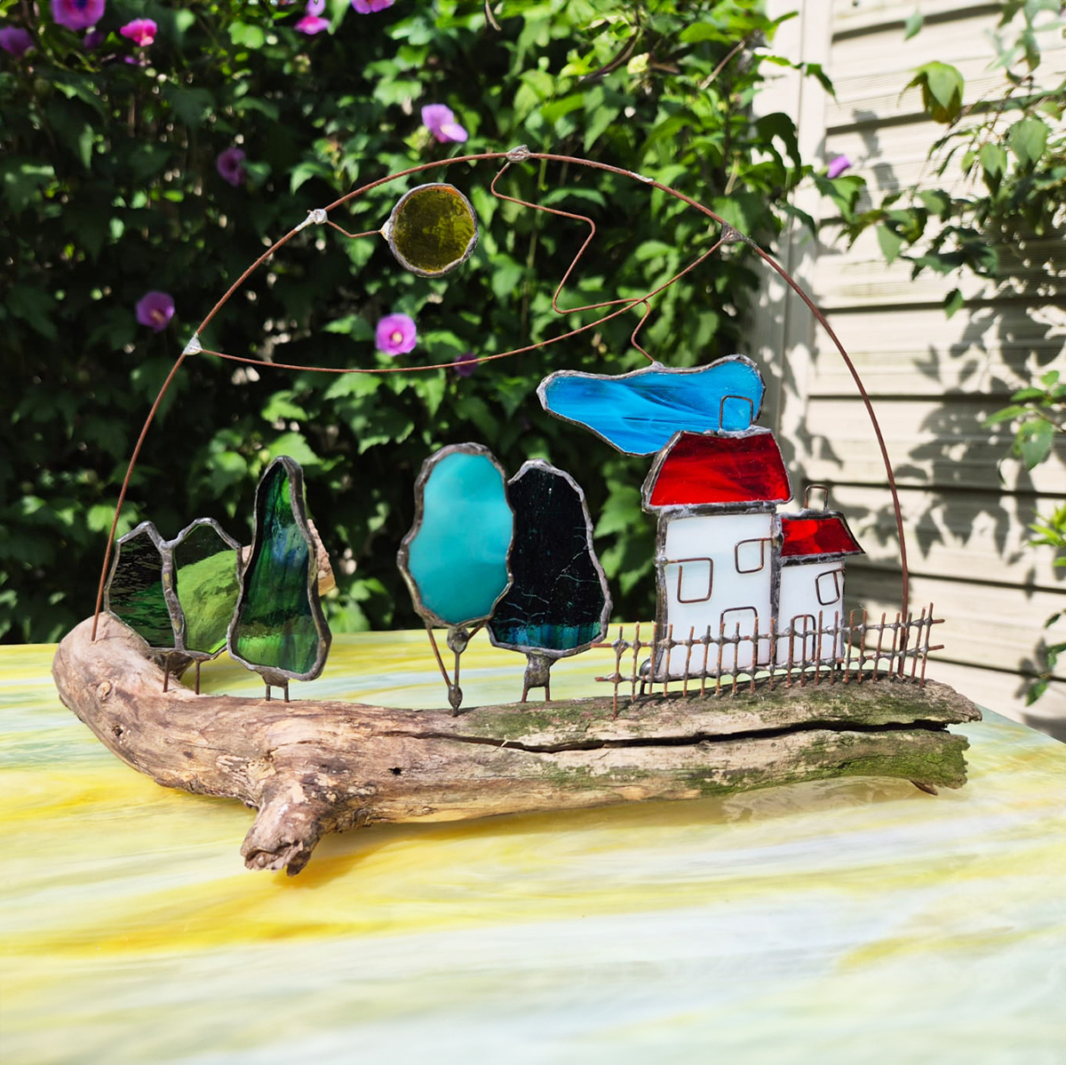 Witraże wykonane metodą Tiffany’ego. Po uprzednim przygotowaniu projektu, z tafli szkła witrażowego wycina się pojedyncze detale i odpowiednio szlifuje. Następnie owijamy każdy szklany element cieką miedzianą taśmą i łączymy za pomocą cyny.