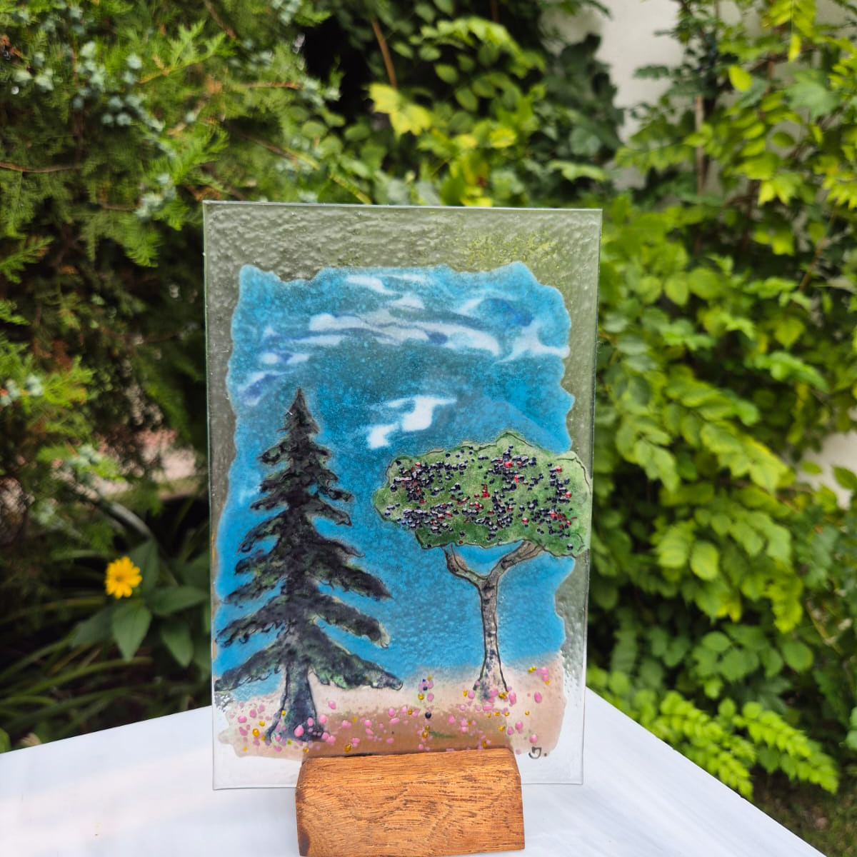 Kontury, kolory, dekoracyjne fryty nakładamy z każdej strony szkła co pozwala uzyskać głębie wykonanej pracy. Malunek utrwalany w procesie wypalania w piecu i jednocześnie dzięki procesowi zgrzewania i krystalizacji szkła wydobywamy piękno kolorów barw.