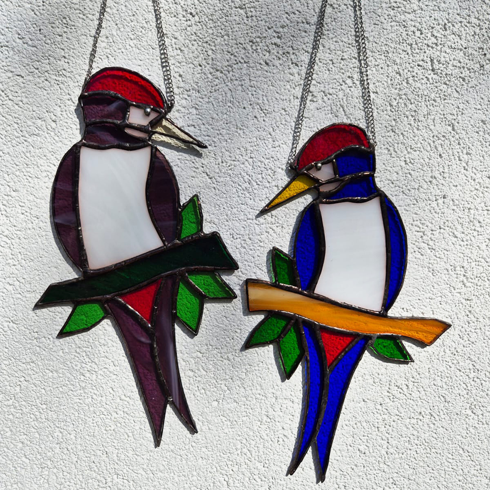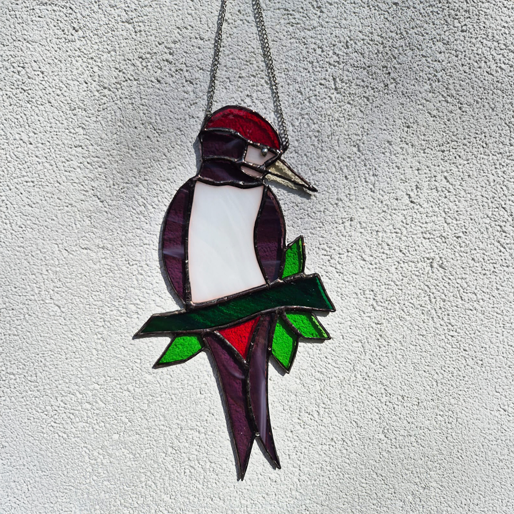 Dzięcioł wiszący wykonany metodą Tiffaniego witraż wiszący