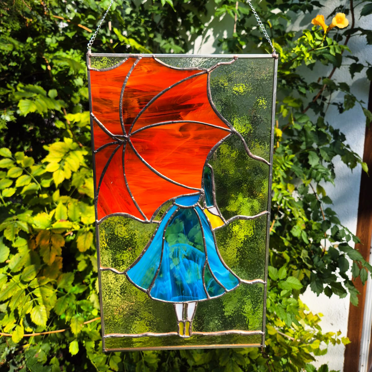 Witraże wykonane metodą Tiffany’ego. Po uprzednim przygotowaniu projektu, z tafli szkła witrażowego wycina się pojedyncze detale i odpowiednio szlifuje. Następnie owijamy każdy szklany element cieką miedzianą taśmą i łączymy za pomocą cyny.