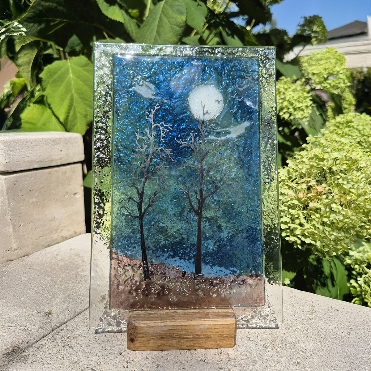 Krajobrazowe obrazy wykonane metodą fusingu z dwóch warstw szkła, zdobione pulwą i frytą szklaną, na eleganckim drewnianym stojaku. Każdy egzemplarz to unikalne rękodzieło.