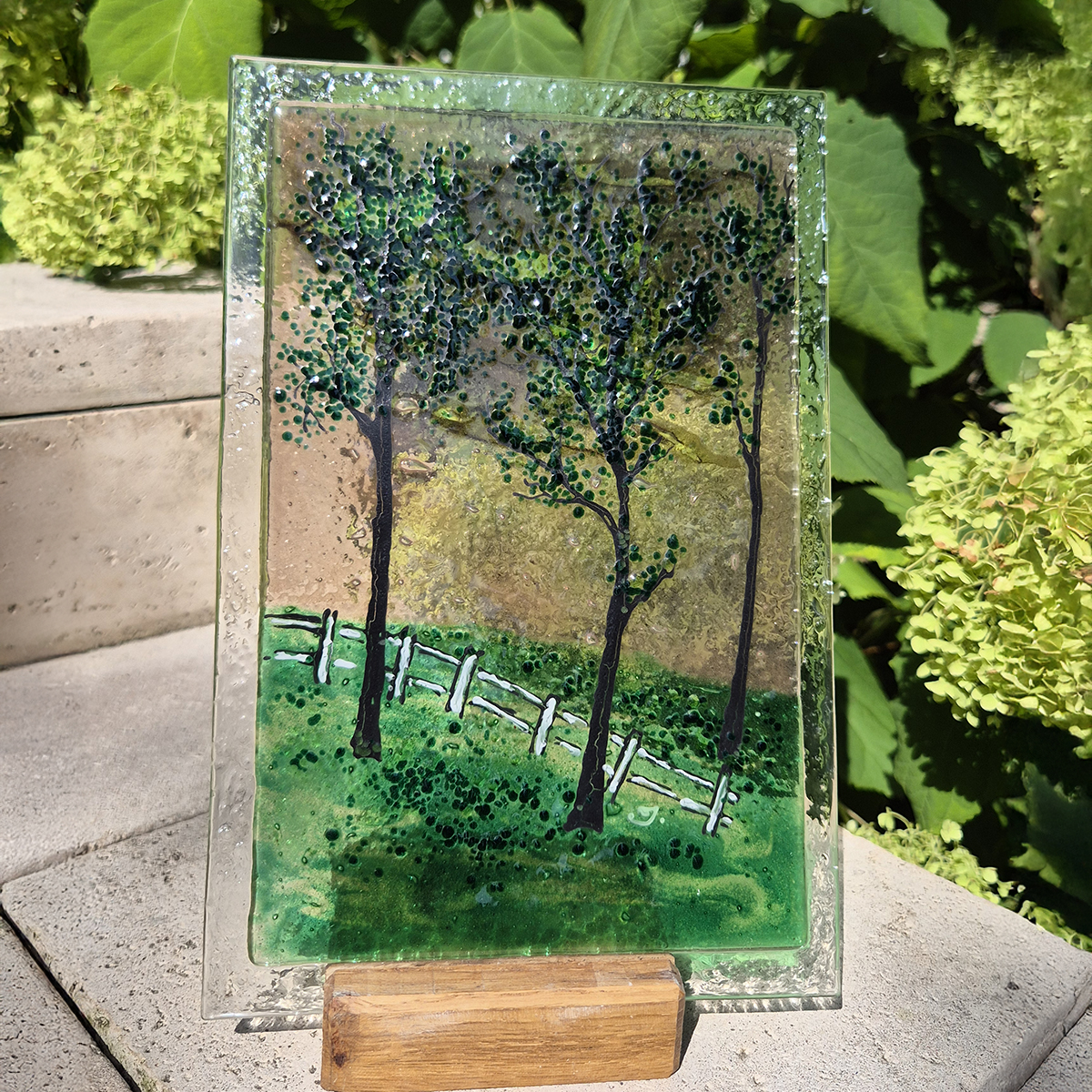 Krajobrazowe obrazy wykonane metodą fusingu z dwóch warstw szkła, zdobione pulwą i frytą szklaną, na eleganckim drewnianym stojaku. Każdy egzemplarz to unikalne rękodzieło.