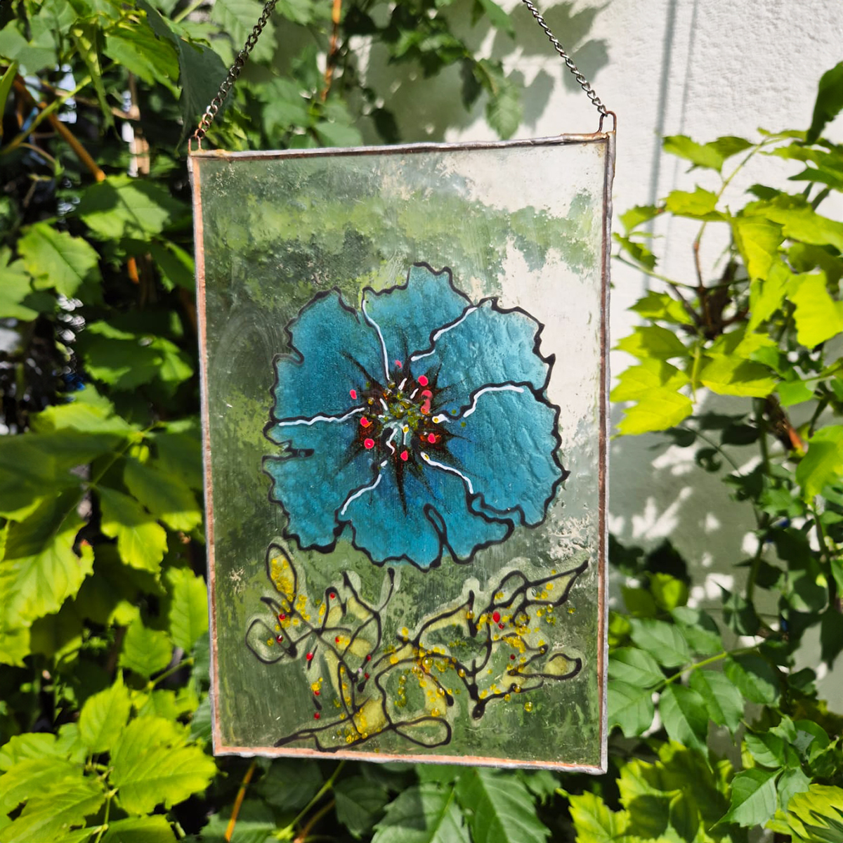 Kontury, kolory, dekoracyjne fryty nakładamy z każdej strony szkła co pozwala uzyskać głębie wykonanej pracy. Malunek utrwalany w procesie wypalania w piecu i jednocześnie dzięki procesowi zgrzewania i krystalizacji szkła wydobywamy piękno kolorów barw.