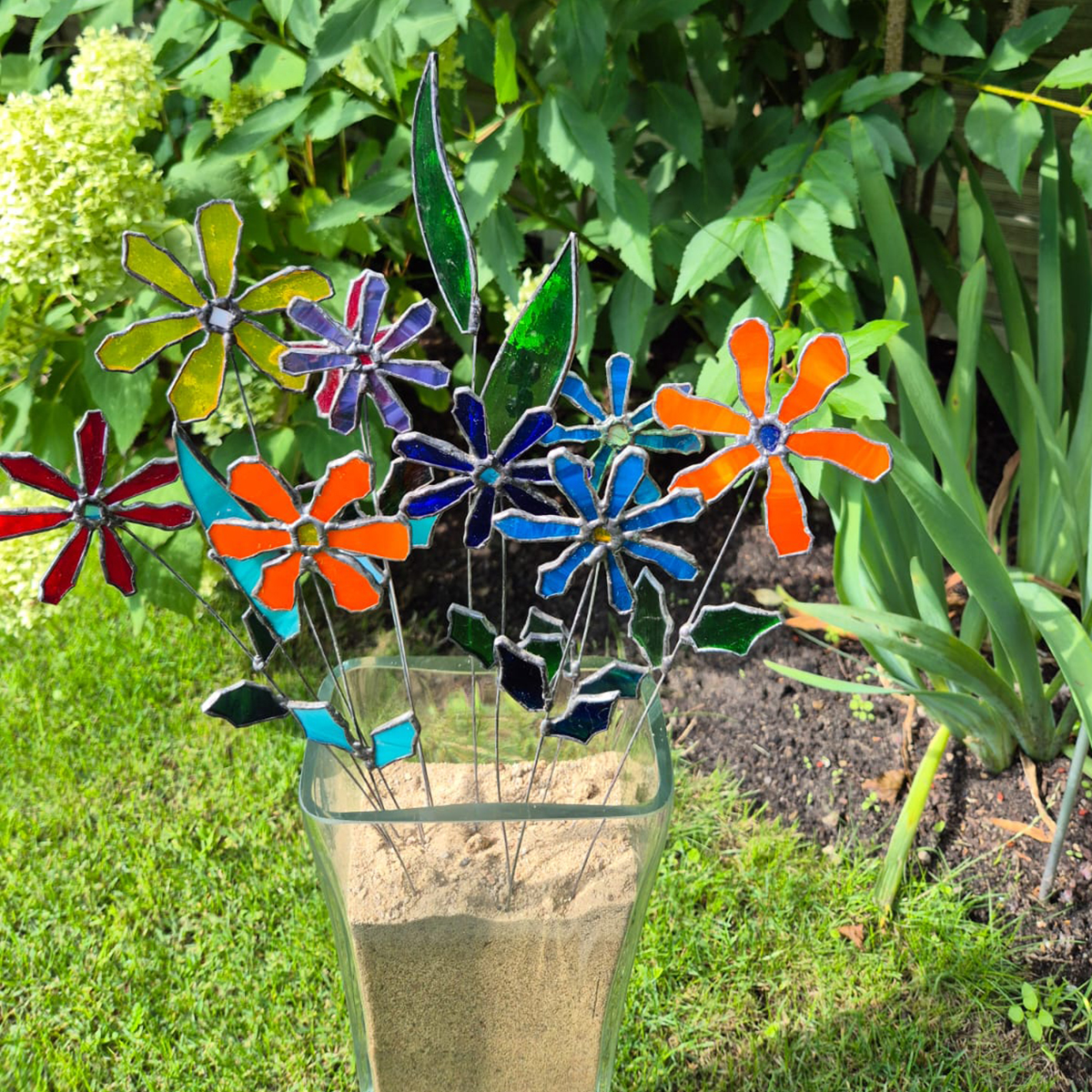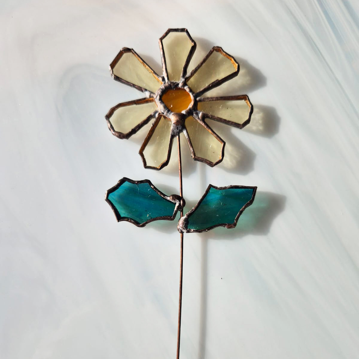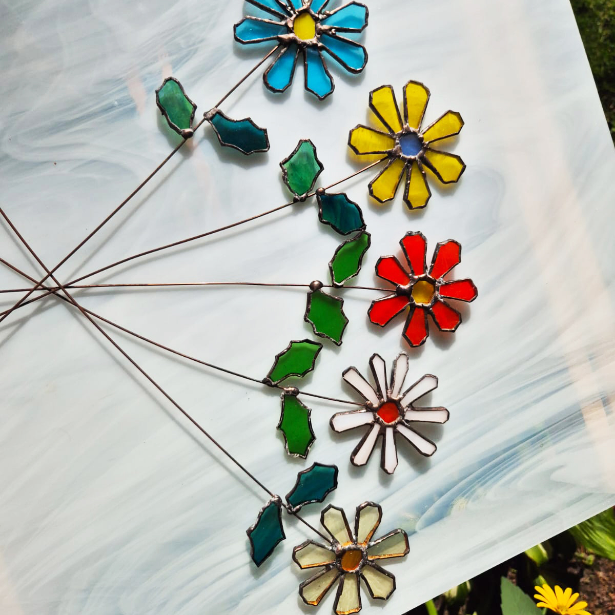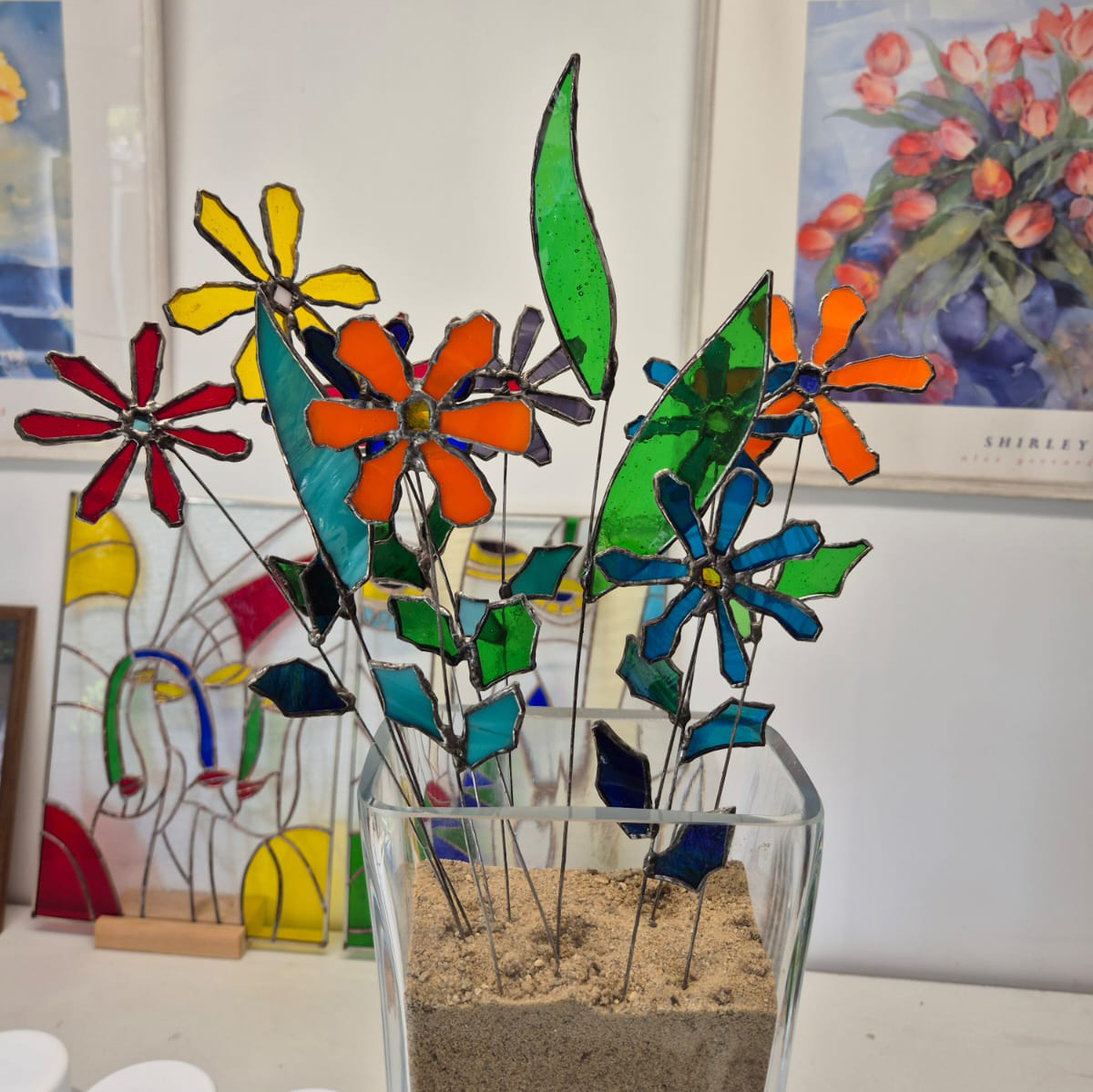 Witraże wykonane metodą Tiffany’ego. Po uprzednim przygotowaniu projektu, z tafli szkła witrażowego wycina się pojedyncze detale i odpowiednio szlifuje. Następnie owijamy każdy szklany element cieką miedzianą taśmą i łączymy za pomocą cyny.