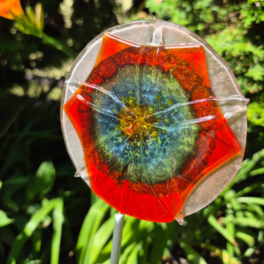 Kolorowe kwiaty ze szkła wykonane metodą fusingu — ręcznie wykonana ozdoba ogrodowa odporna na warunki atmosferyczne, idealna do rabat i donic.