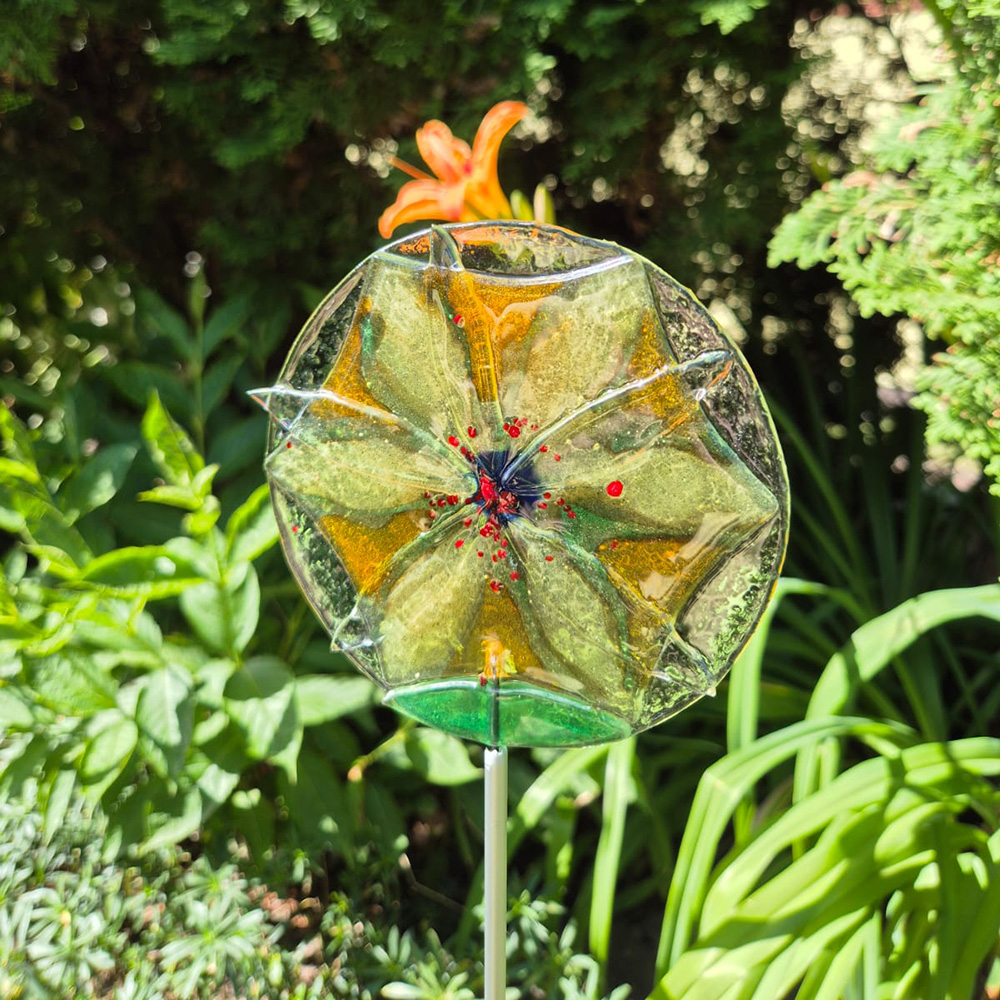 Kolorowe kwiaty ze szkła wykonane metodą fusingu — ręcznie wykonana ozdoba ogrodowa odporna na warunki atmosferyczne, idealna do rabat i donic.