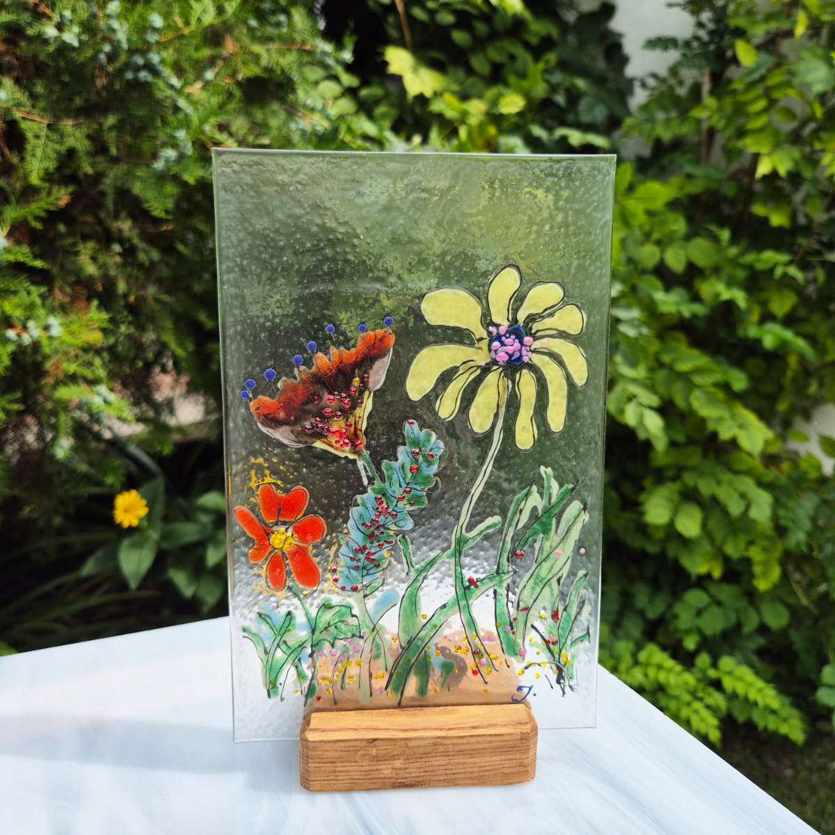 Kontury, kolory, dekoracyjne fryty nakładamy z każdej strony szkła co pozwala uzyskać głębie wykonanej pracy. Malunek utrwalany w procesie wypalania w piecu i jednocześnie dzięki procesowi zgrzewania i krystalizacji szkła wydobywamy piękno kolorów barw.