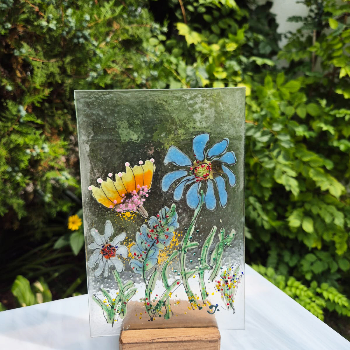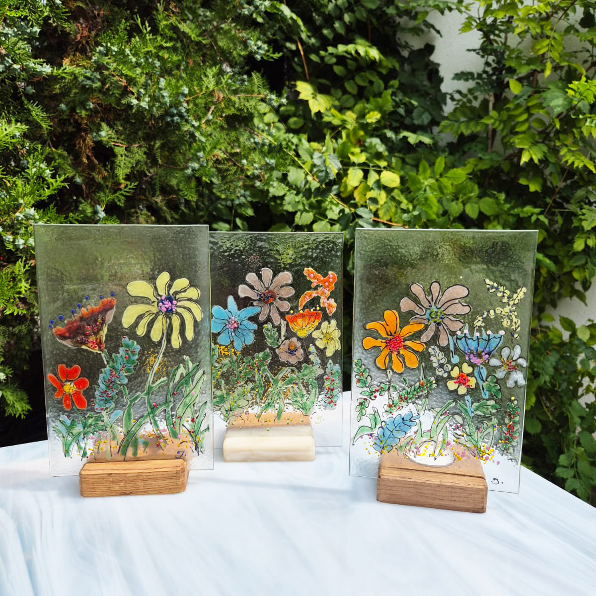 Kontury, kolory, dekoracyjne fryty nakładamy z każdej strony szkła co pozwala uzyskać głębie wykonanej pracy. Malunek utrwalany w procesie wypalania w piecu i jednocześnie dzięki procesowi zgrzewania i krystalizacji szkła wydobywamy piękno kolorów barw.