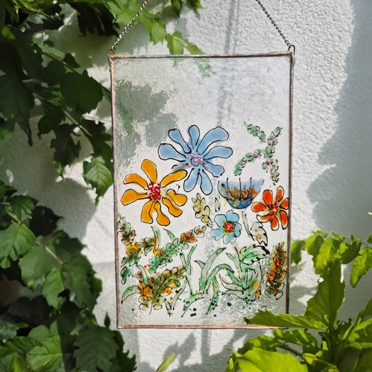Kontury, kolory, dekoracyjne fryty nakładamy z każdej strony szkła co pozwala uzyskać głębie wykonanej pracy. Malunek utrwalany w procesie wypalania w piecu i jednocześnie dzięki procesowi zgrzewania i krystalizacji szkła wydobywamy piękno kolorów barw.