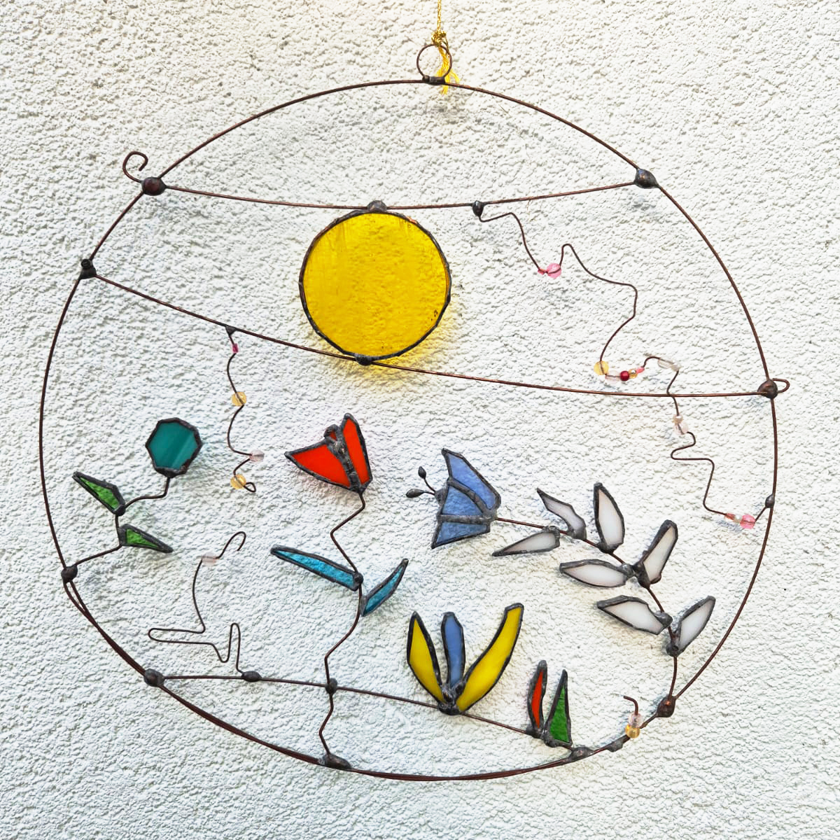 Witraże wykonane metodą Tiffany’ego. Po uprzednim przygotowaniu projektu, z tafli szkła witrażowego wycina się pojedyncze detale i odpowiednio szlifuje. Następnie owijamy każdy szklany element cieką miedzianą taśmą i łączymy za pomocą cyny.