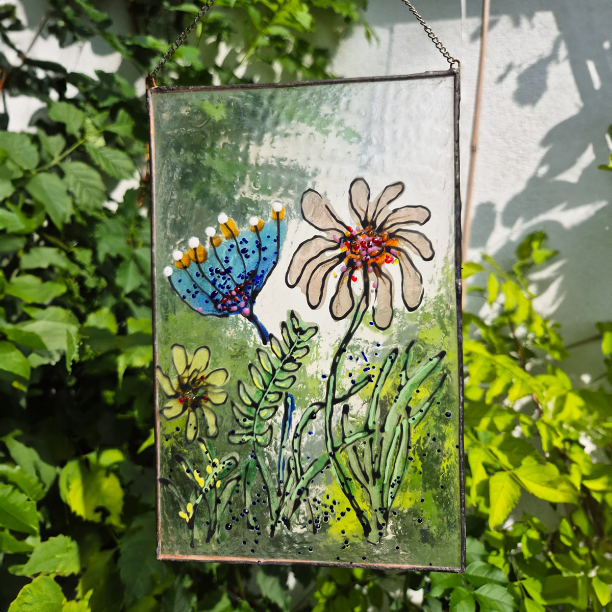 Kontury, kolory, dekoracyjne fryty nakładamy z każdej strony szkła co pozwala uzyskać głębie wykonanej pracy. Malunek utrwalany w procesie wypalania w piecu i jednocześnie dzięki procesowi zgrzewania i krystalizacji szkła wydobywamy piękno kolorów barw.