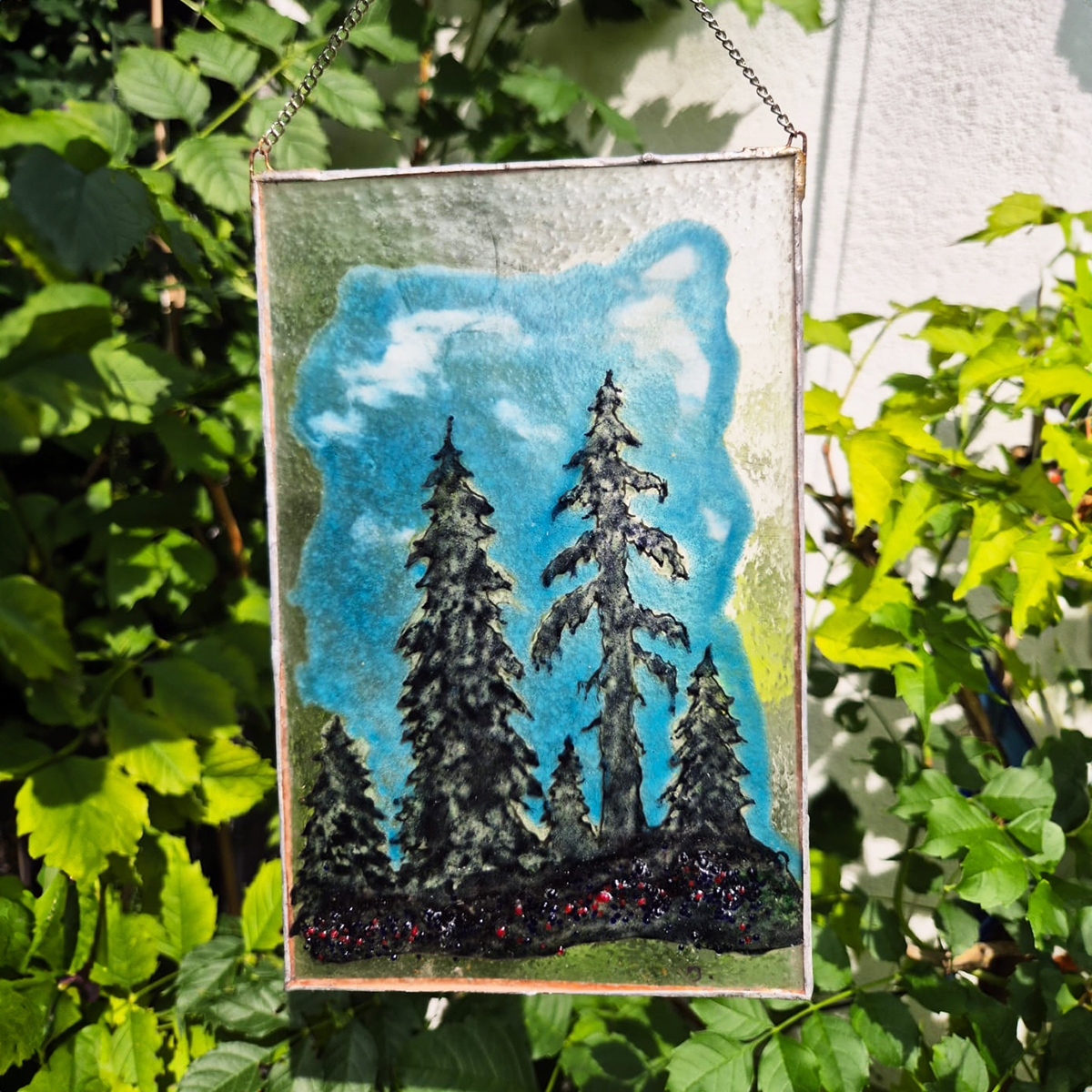 Kontury, kolory, dekoracyjne fryty nakładamy z każdej strony szkła co pozwala uzyskać głębie wykonanej pracy. Malunek utrwalany w procesie wypalania w piecu i jednocześnie dzięki procesowi zgrzewania i krystalizacji szkła wydobywamy piękno kolorów barw.