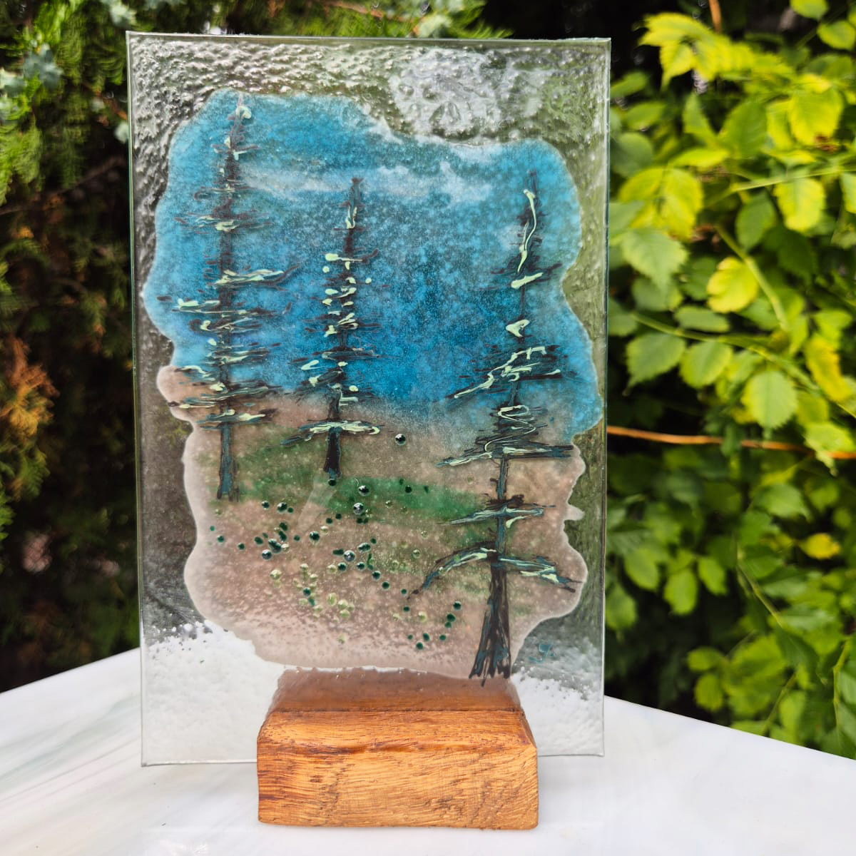 Kontury, kolory, dekoracyjne fryty nakładamy z każdej strony szkła co pozwala uzyskać głębie wykonanej pracy. Malunek utrwalany w procesie wypalania w piecu i jednocześnie dzięki procesowi zgrzewania i krystalizacji szkła wydobywamy piękno kolorów barw.