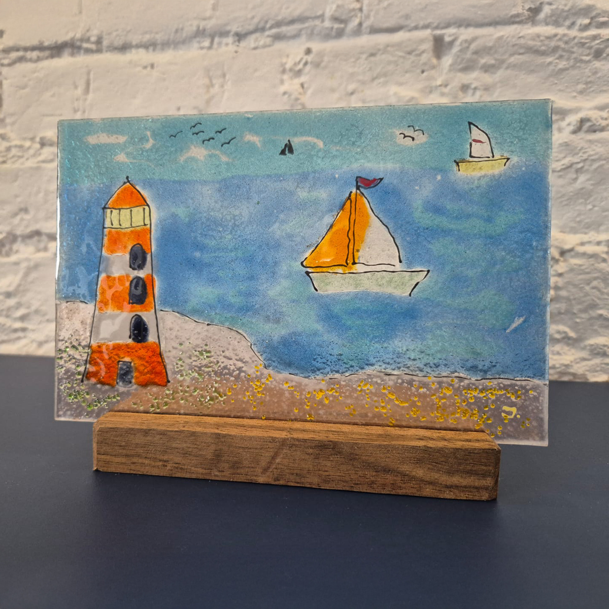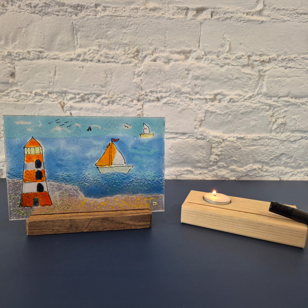 Latarnia Morska to wyjątkowa, ręcznie wykonana ozdoba stojąca ze szkła, stworzona metodą fusingu. Inspirowana nadmorskim klimatem, łączy w sobie dekoracyjny charakter z funkcją świecznika – po zapaleniu tealighta delikatnie rozświetla wnętrze, tworząc nastrojową atmosferę. Idealna dla miłośników morza, światła i unikalnych detali.