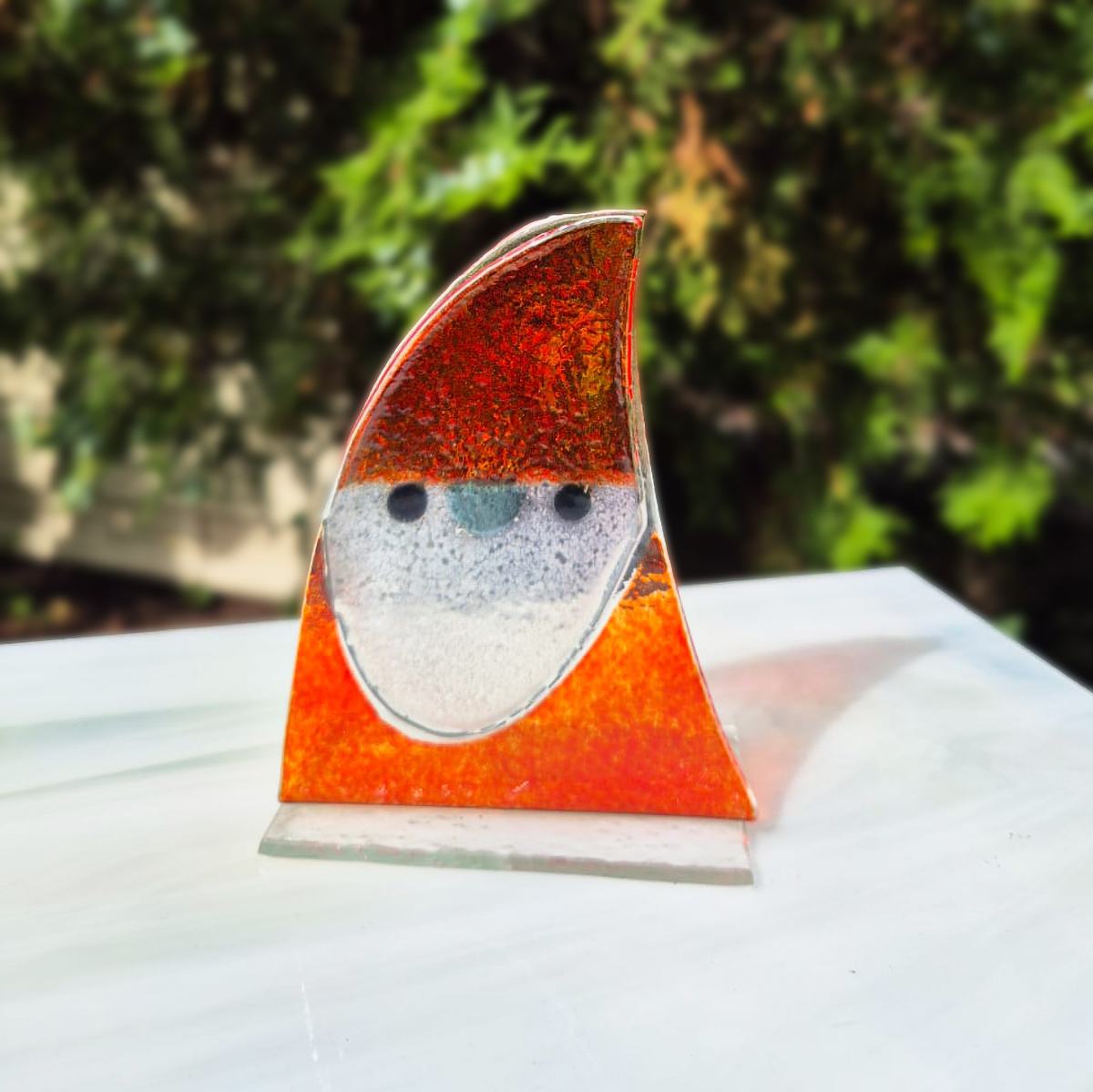 Praca wykonana z wcześniej ręcznie wyciętych elementów szklanych. Następnie udekorowana farbami do fusingu i wypalona w specjalistycznym piecu w temperaturze 810°C.