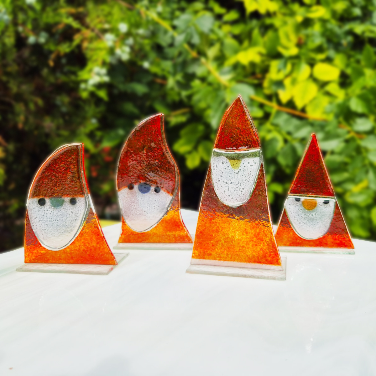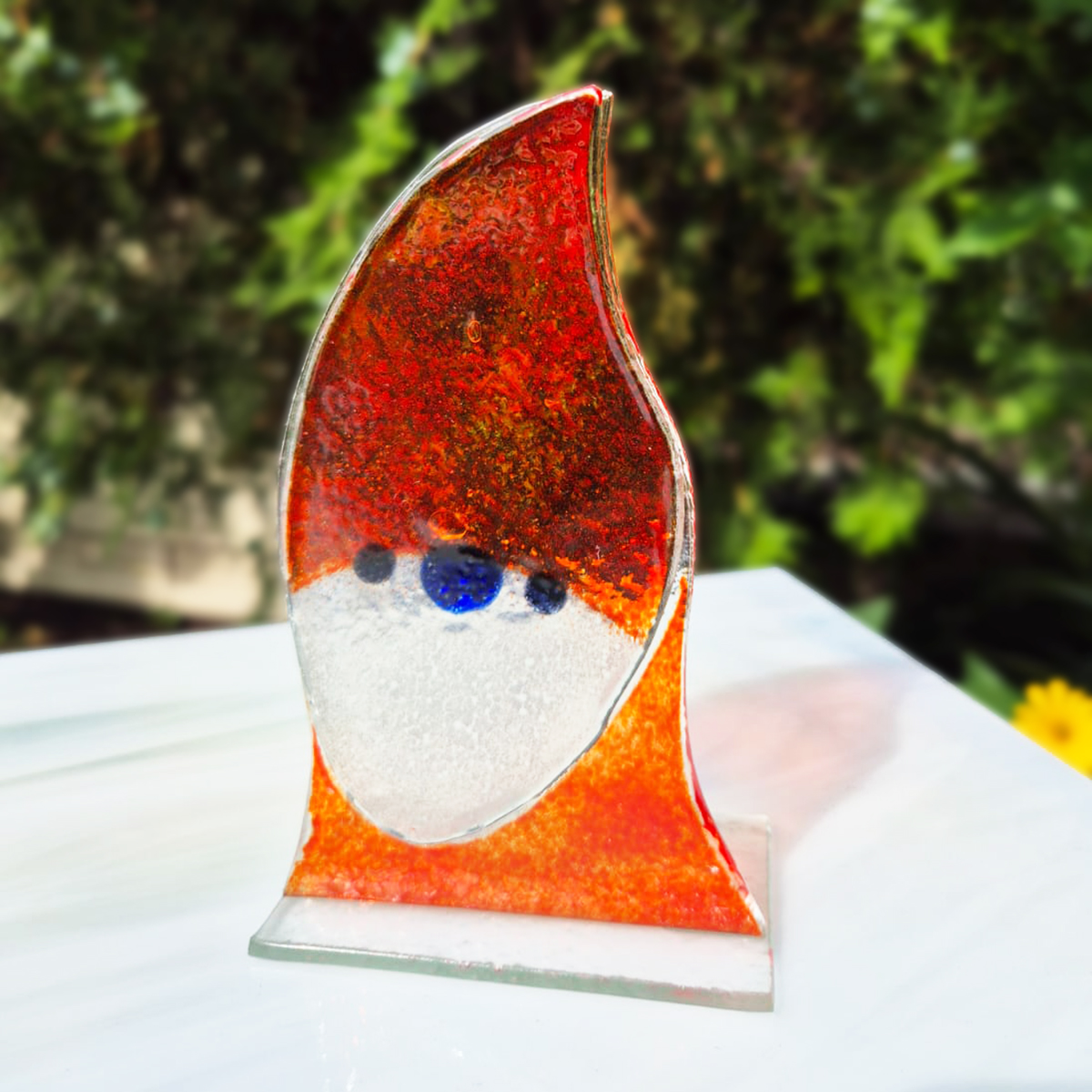 Praca wykonana z wcześniej ręcznie wyciętych elementów szklanych. Następnie udekorowana farbami do fusingu i wypalona w specjalistycznym piecu w temperaturze 810°C.