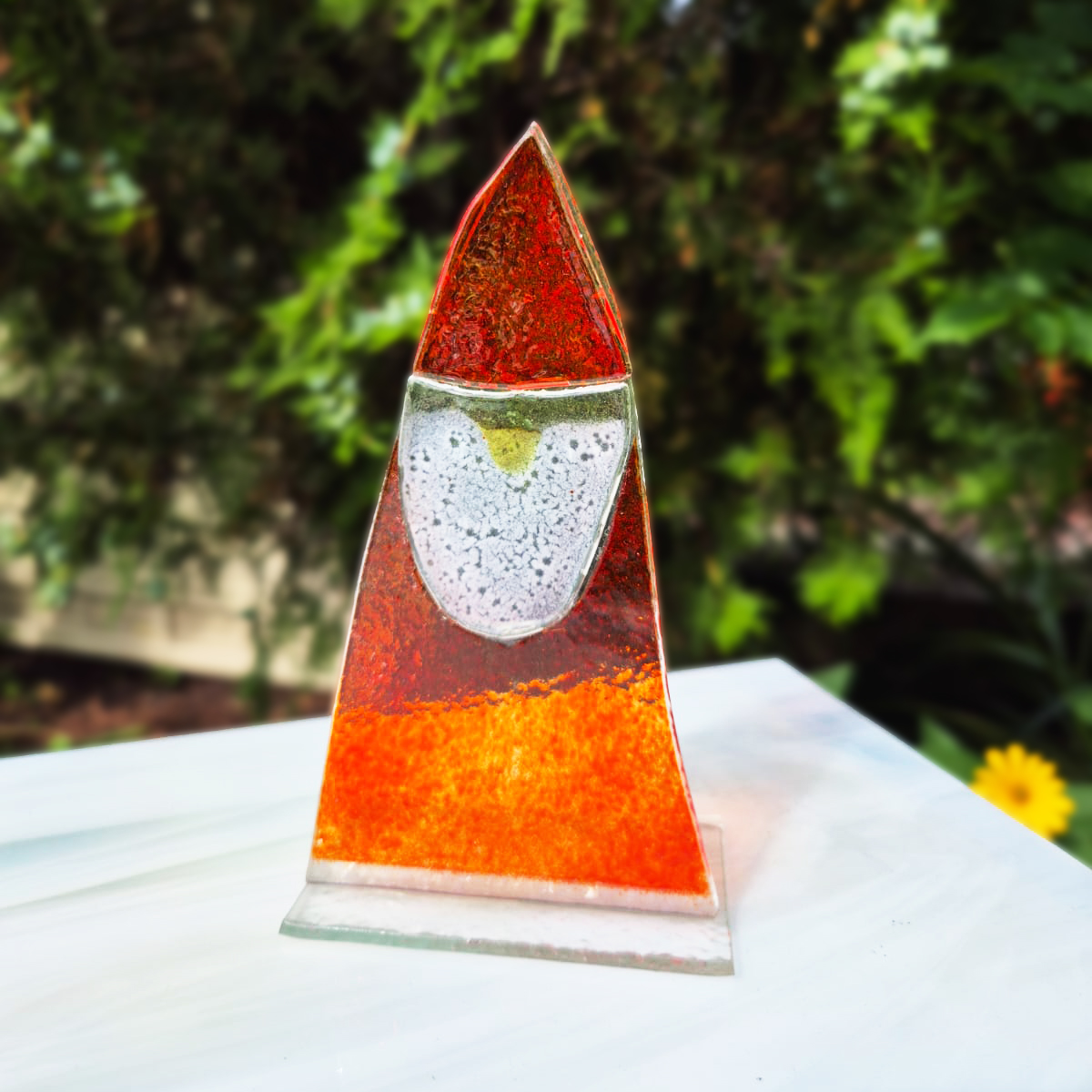 Praca wykonana z wcześniej ręcznie wyciętych elementów szklanych. Następnie udekorowana farbami do fusingu i wypalona w specjalistycznym piecu w temperaturze 810°C.