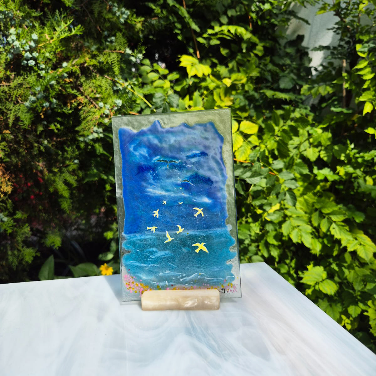 Kontury, kolory, dekoracyjne fryty nakładamy z każdej strony szkła co pozwala uzyskać głębie wykonanej pracy. Malunek utrwalany w procesie wypalania w piecu i jednocześnie dzięki procesowi zgrzewania i krystalizacji szkła wydobywamy piękno kolorów barw.