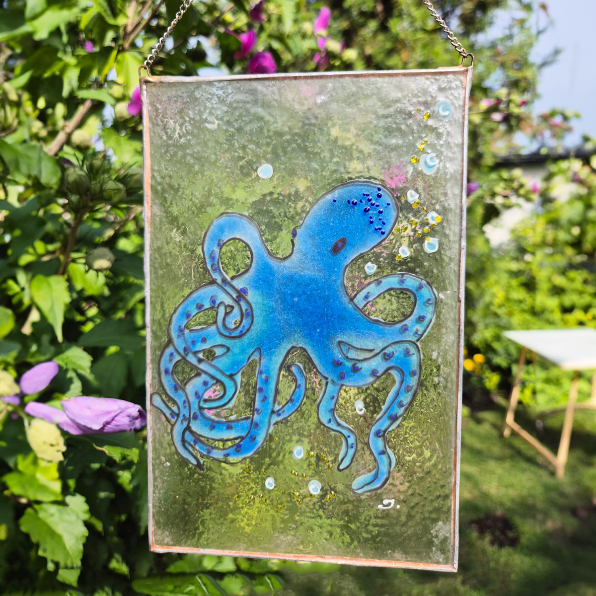 Kontury, kolory, dekoracyjne fryty nakładamy z każdej strony szkła co pozwala uzyskać głębie wykonanej pracy. Malunek utrwalany w procesie wypalania w piecu i jednocześnie dzięki procesowi zgrzewania i krystalizacji szkła wydobywamy piękno kolorów barw.