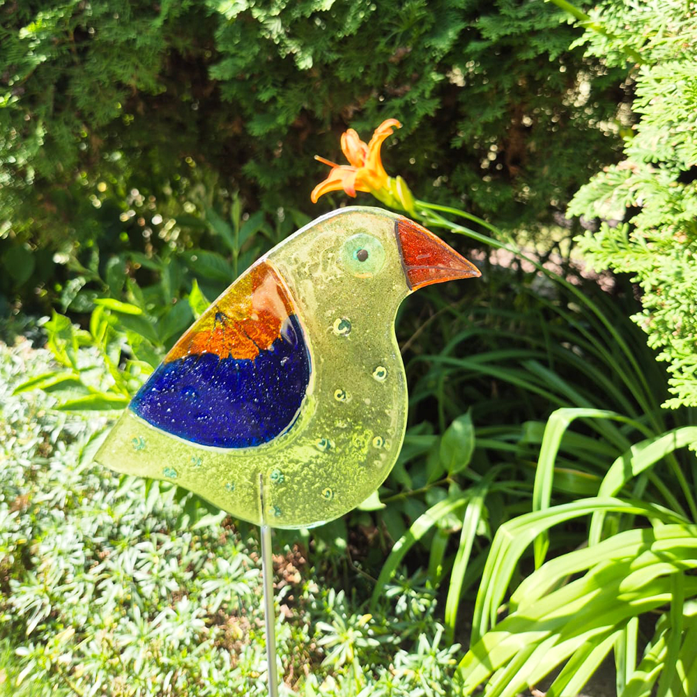 Szklany ptak do ogrodu to wyjątkowa dekoracja wykonana ręcznie metodą fusingu. Barwna kompozycja szkła stapianego w wysokiej temperaturze sprawia, że każdy ptak jest unikalny – pełen charakteru, koloru i lekkości. Doskonale prezentuje się wśród roślin, na rabatach, przy ścieżkach lub w donicach, nadając ogrodowi artystyczny i radosny akcent. Do każdej pracy dołączona jest rurka aluminiowa, która ułatwia stabilne umieszczenie ptaka w podłożu.